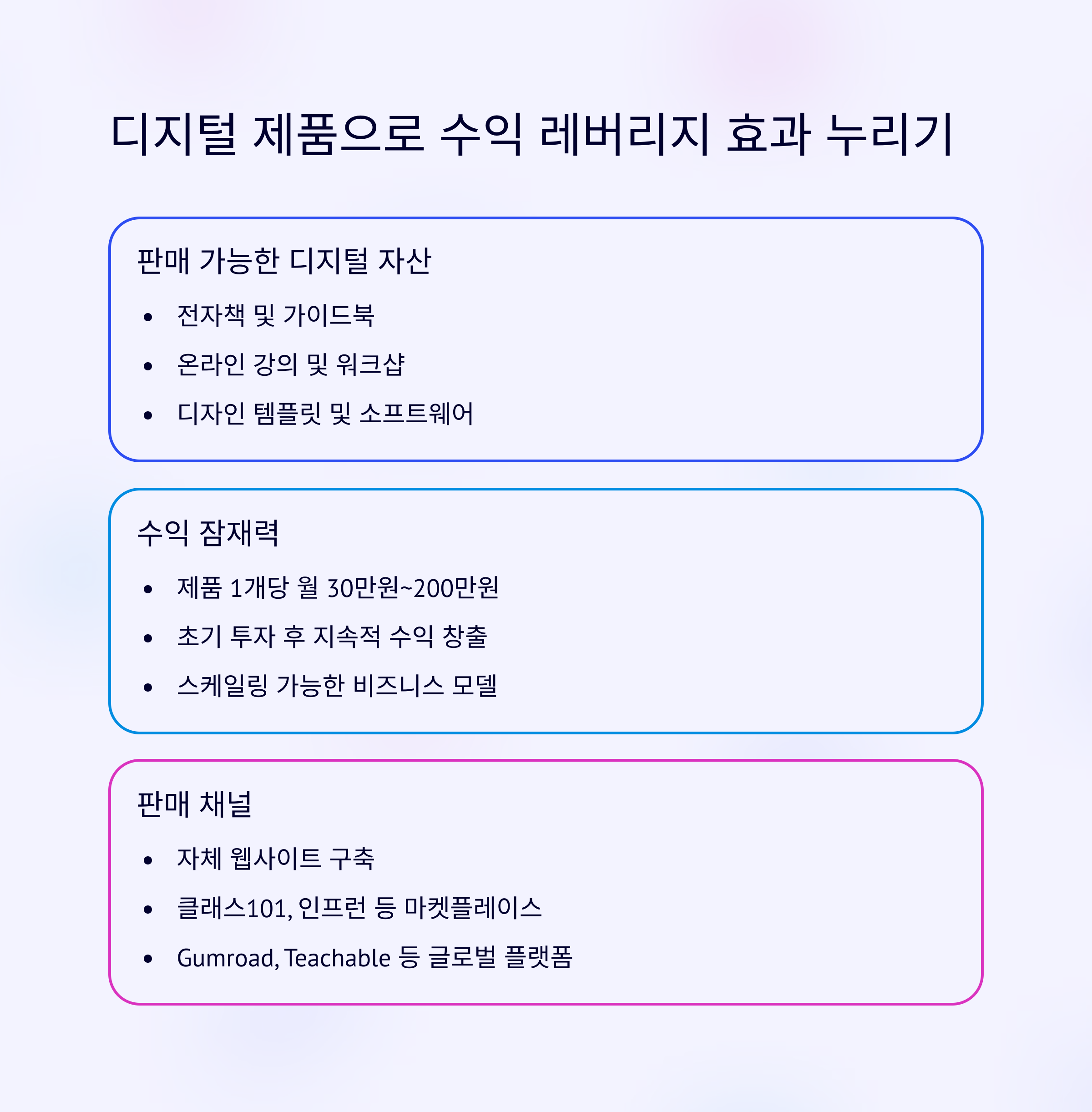 | 디지털 제품 판매 | 100~1,000만 원 | 템플릿, 강의, 콘텐츠 번들 |