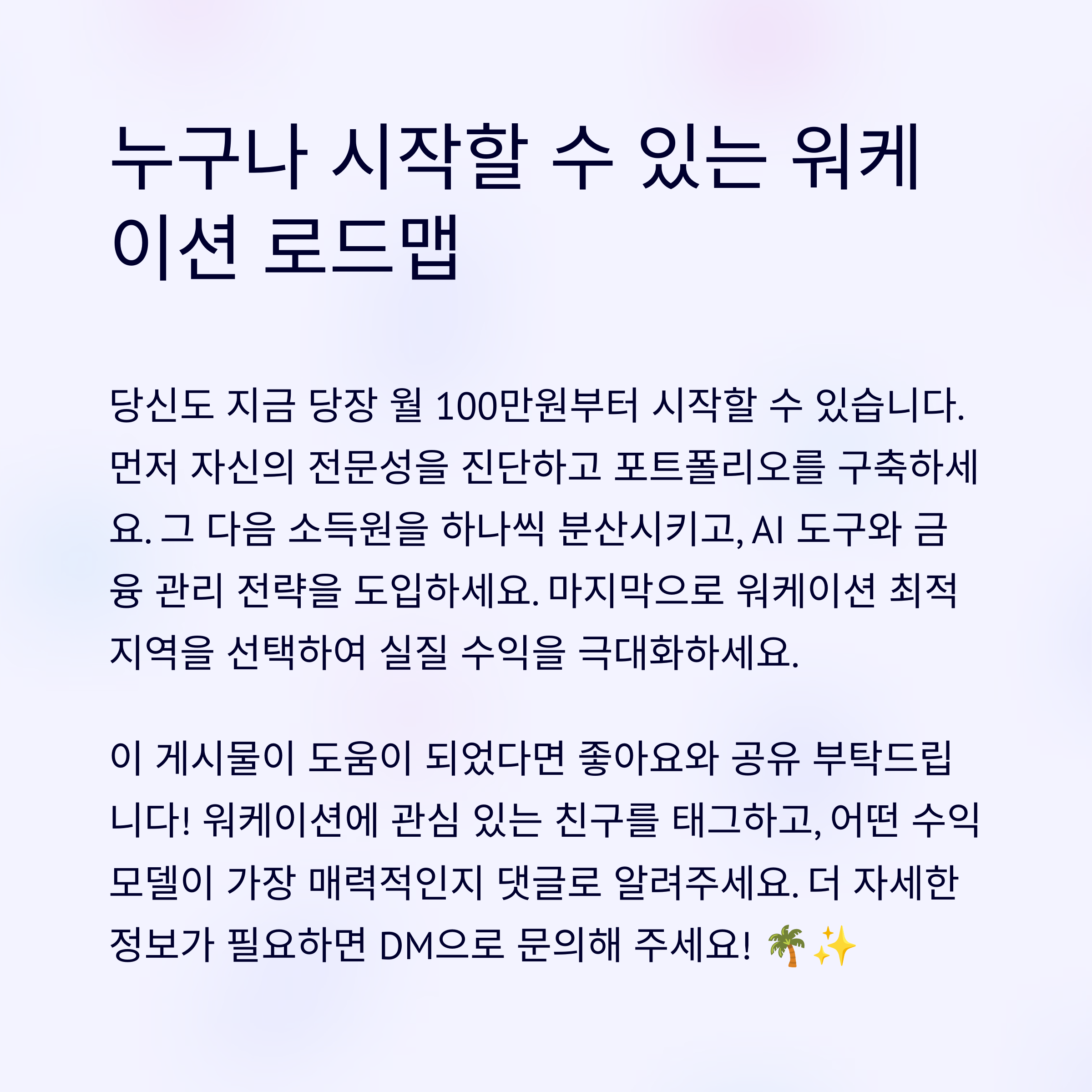 2025년 프리랜서 워케이션은 더 이상 꿈이 아닙니다. 기술 역량 강화, 자동화 도구 활용, 금융 계획 수립을 기반으로 수익을 다각화하면, 여행지에서도 안정적 수익을 올릴 수 있습니다.