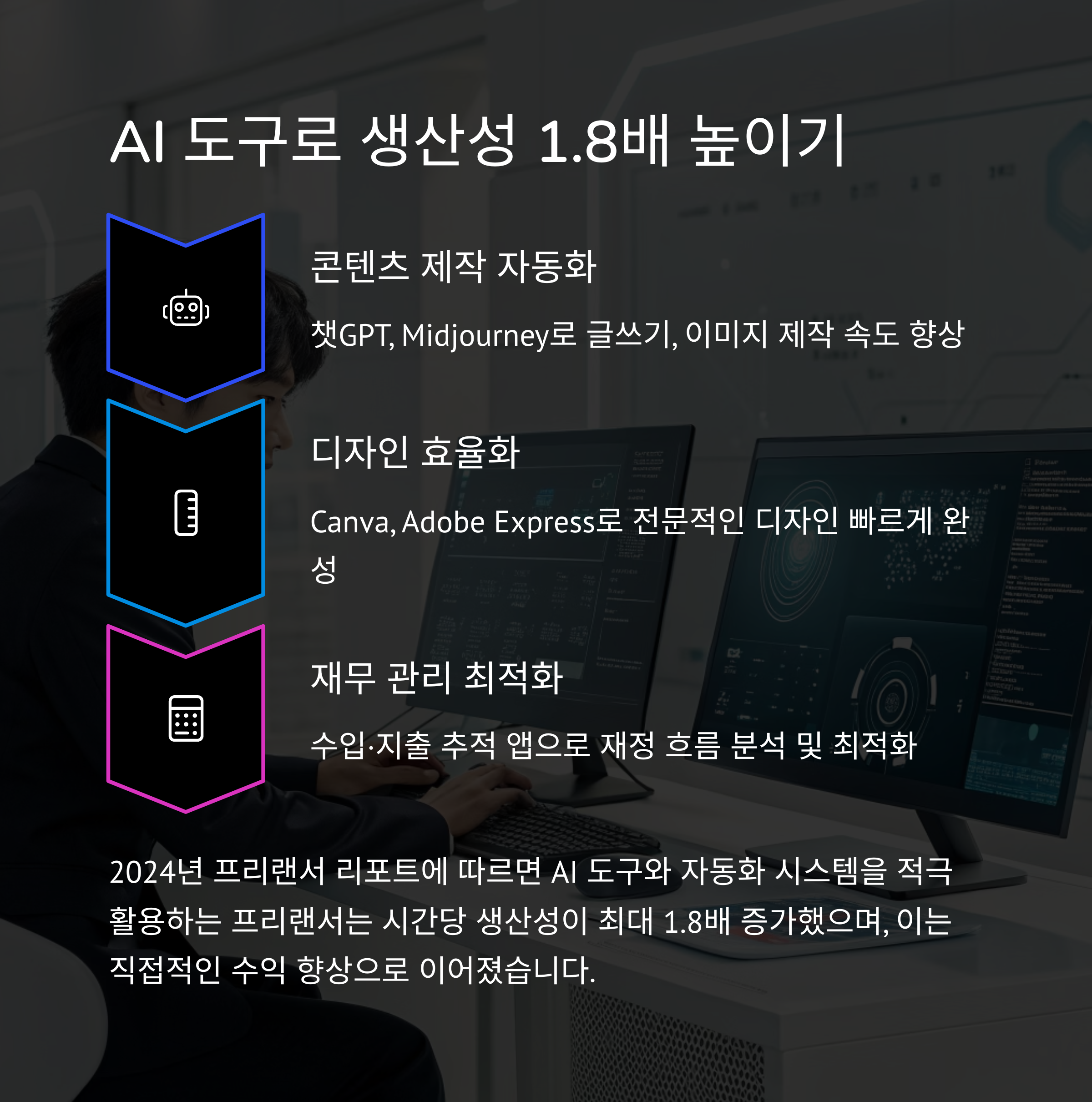 - AI 도구: ChatGPT, Canva, Notion AI, Grammarly 등으로 업무 자동화 및 콘텐츠 생산 효율 상승