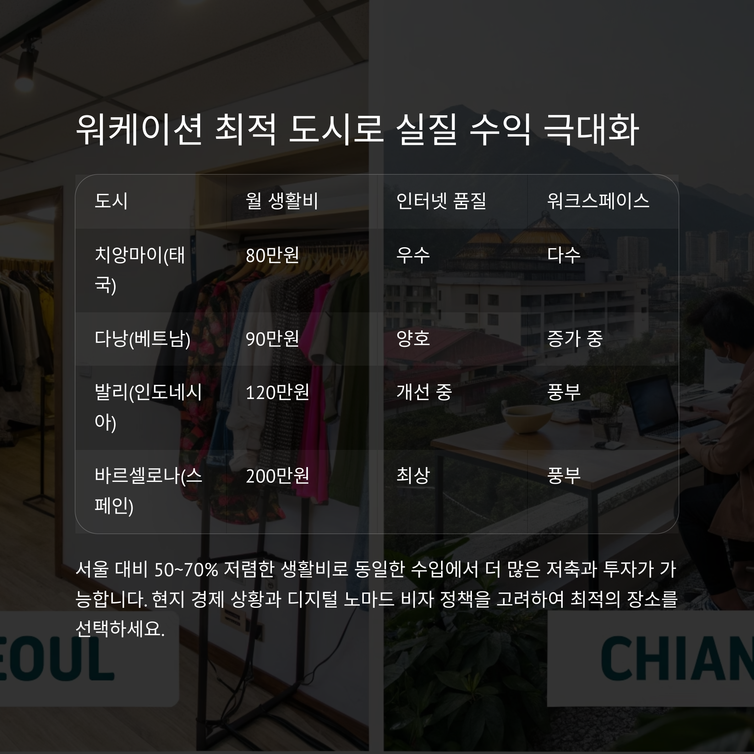 - 지역별 예산: 치앙마이·플라야 델 카르멘 150~200만 원, 리스본 250~300만 원 수준