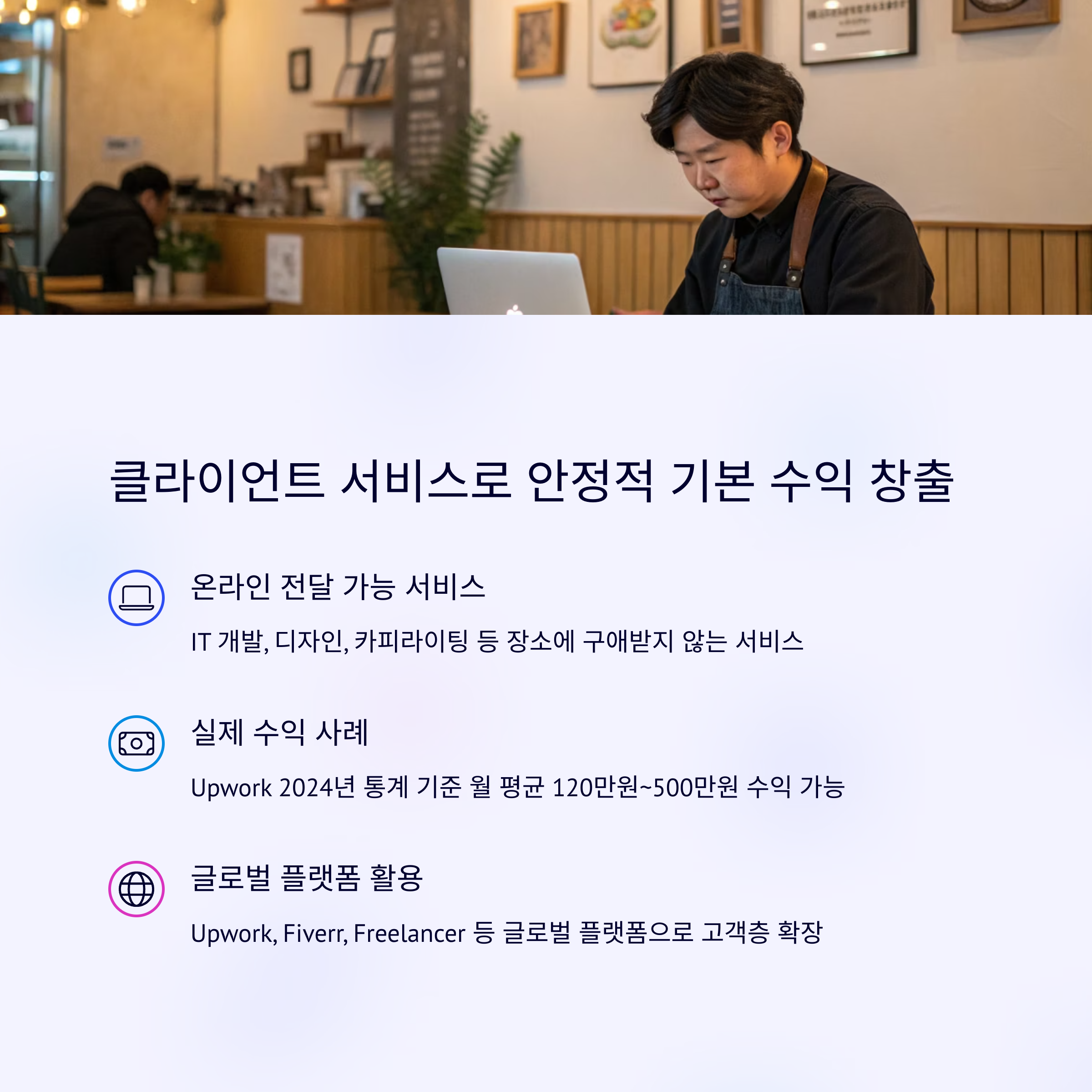 | 클라이언트 서비스 | 300~1,200만 원 | 개발, 디자인, 콘텐츠 등 고수익 직군 중심 |