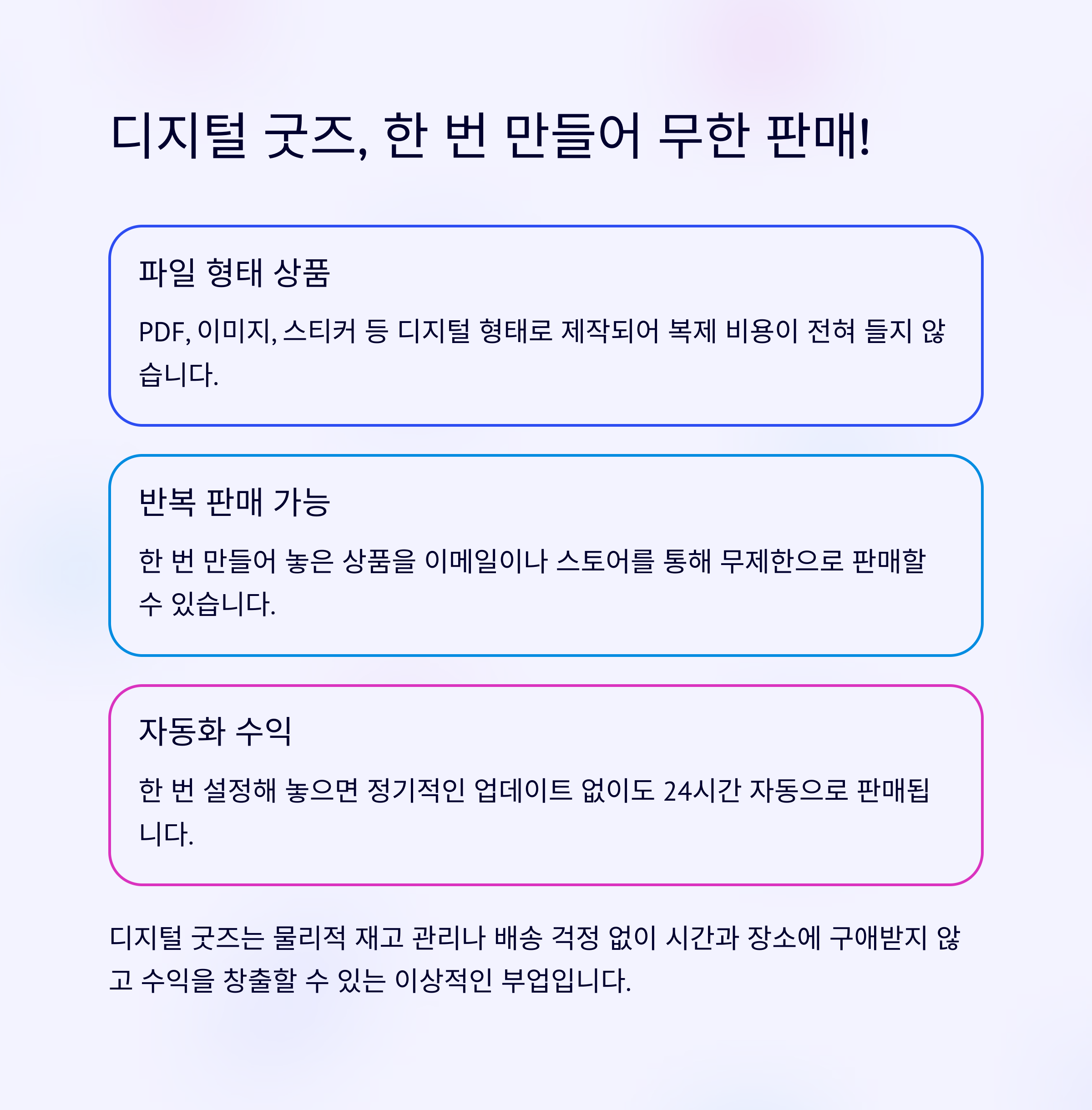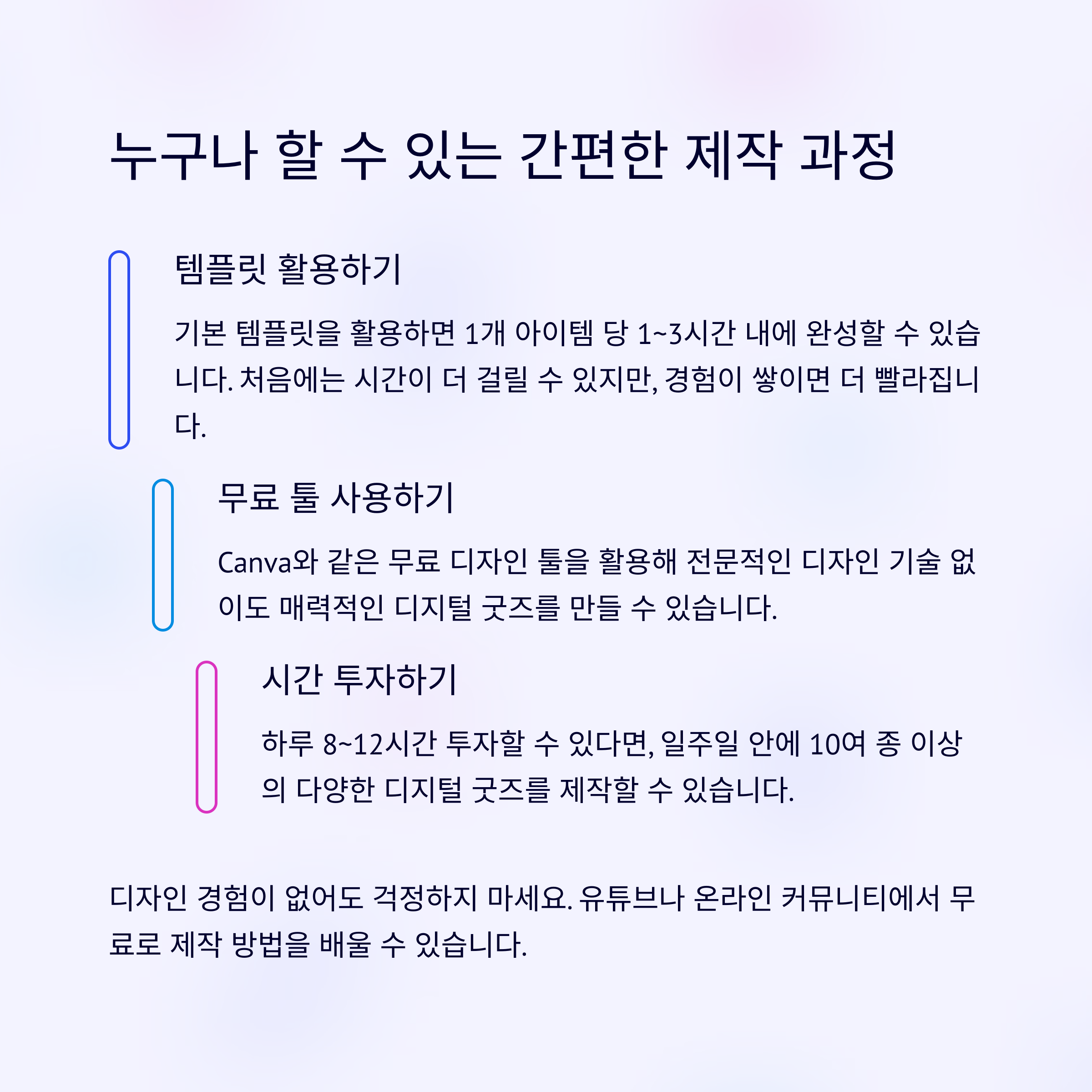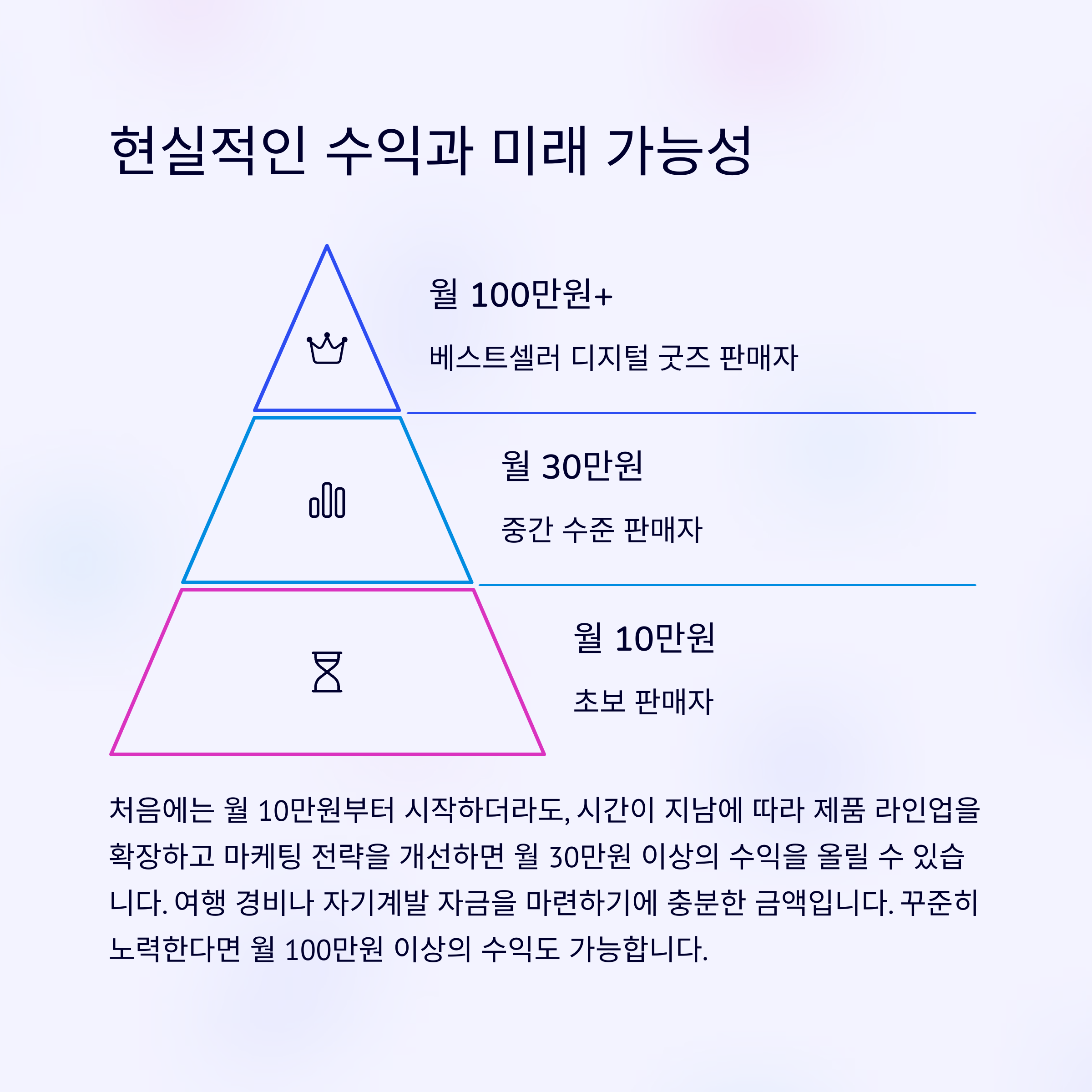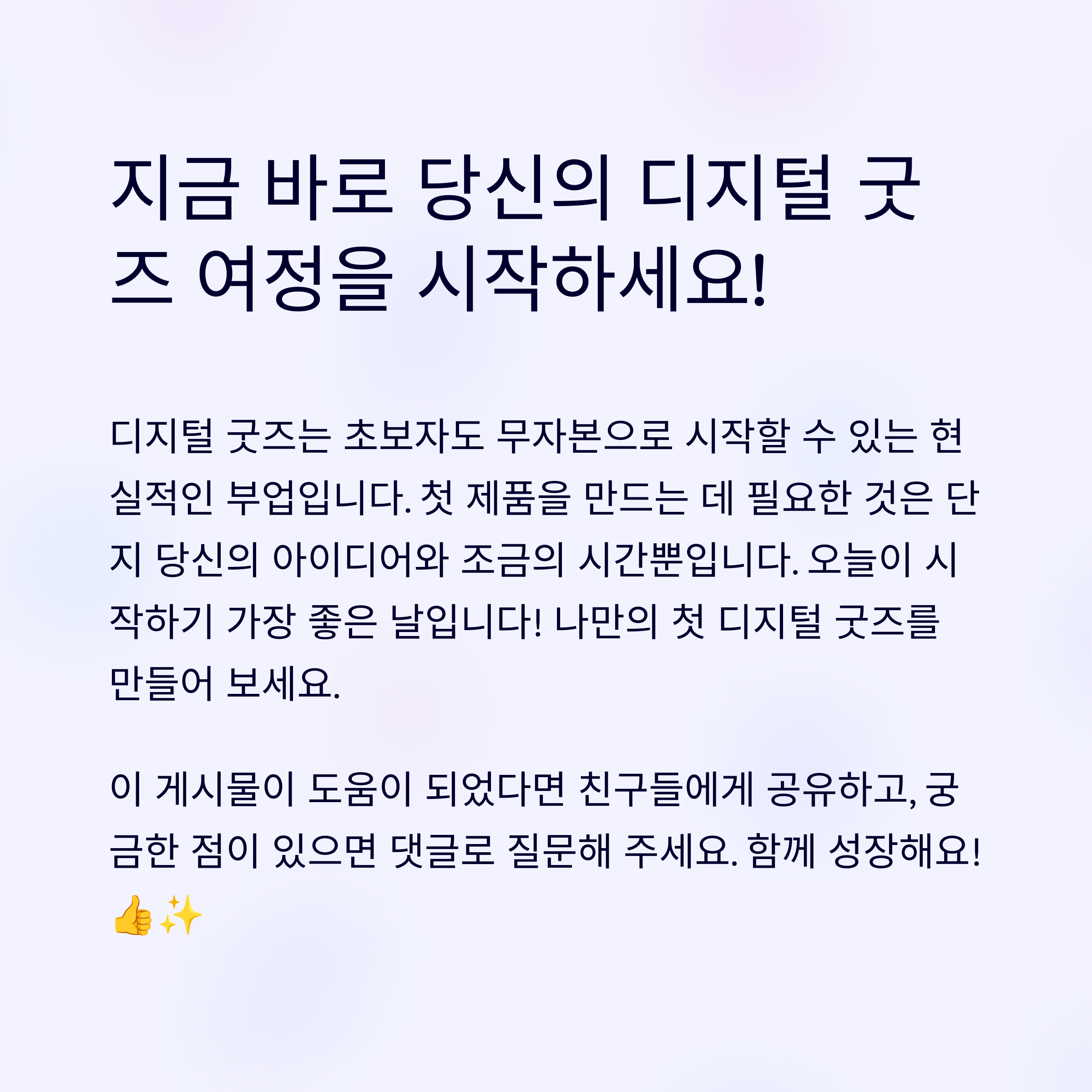 디지털 굿즈 판매는 누구에게나 열려 있는 기회입니다. 디자인 툴에 익숙하지 않아도 무료 템플릿과 AI 도구의 도움을 받아 쉽게 시작할 수 있으며, 반복 판매 구조를 통해 시간 대비 높은 수익을 올릴 수 있습니다. 하루 1~2시간의 짧은 시간 투자로 여행 경비를 마련하거나 소소한 부수입을 얻고 싶은 분들께 매우 적합한 부업입니다. 저작권만 잘 관리하고 꾸준히 상품을 등록하고 마케팅한다면 초보자도 월 10만 원 이상의 수익을 달성하는 것이 현실입니다. 이제 여러분도 디지털 굿즈로 현실적인 부수입을 경험해보세요.