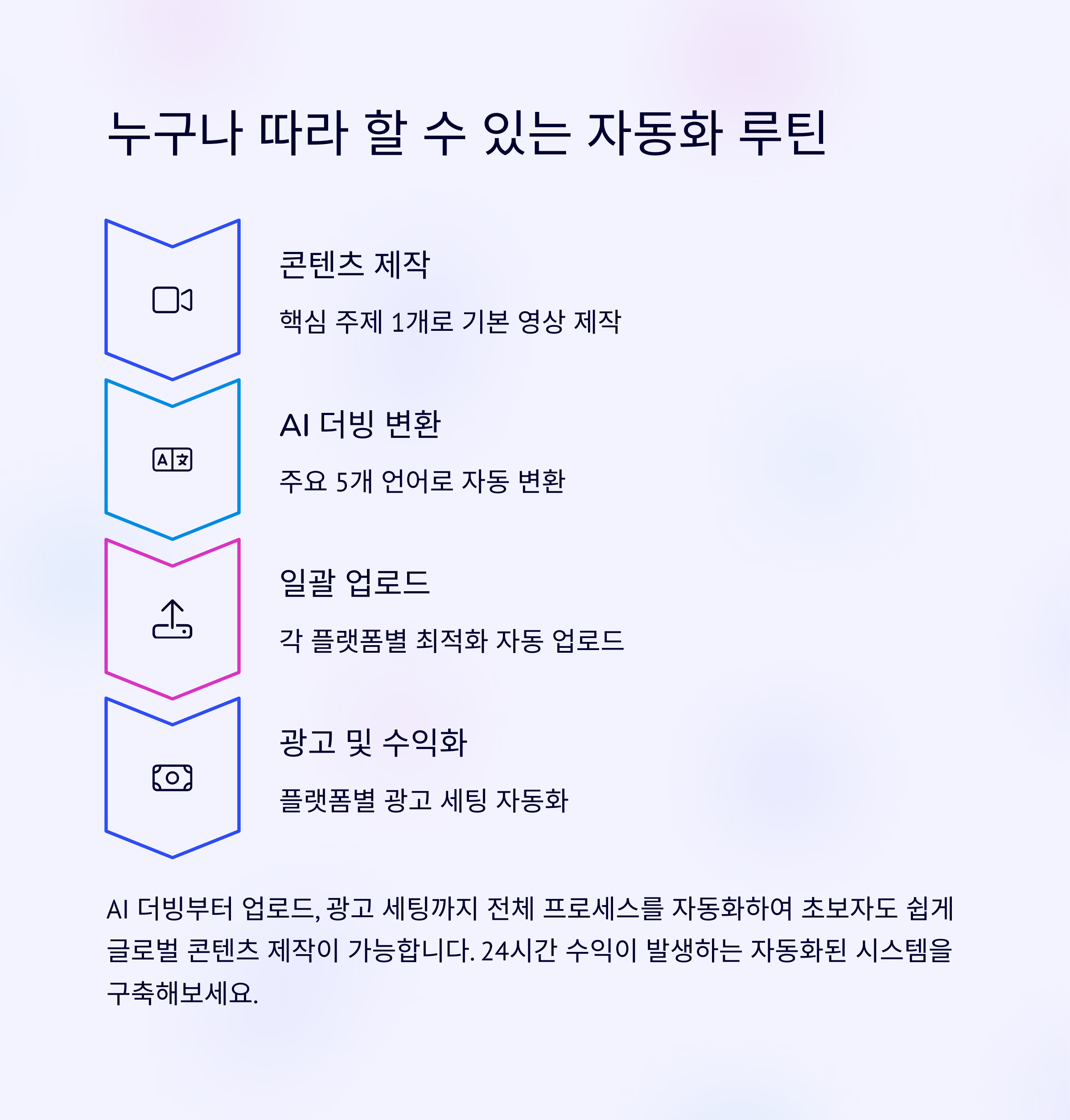 | 자동화 루틴 | 대본 작성 → AI 음성 변환 → 더빙 → 영상 제작 → 업로드 |