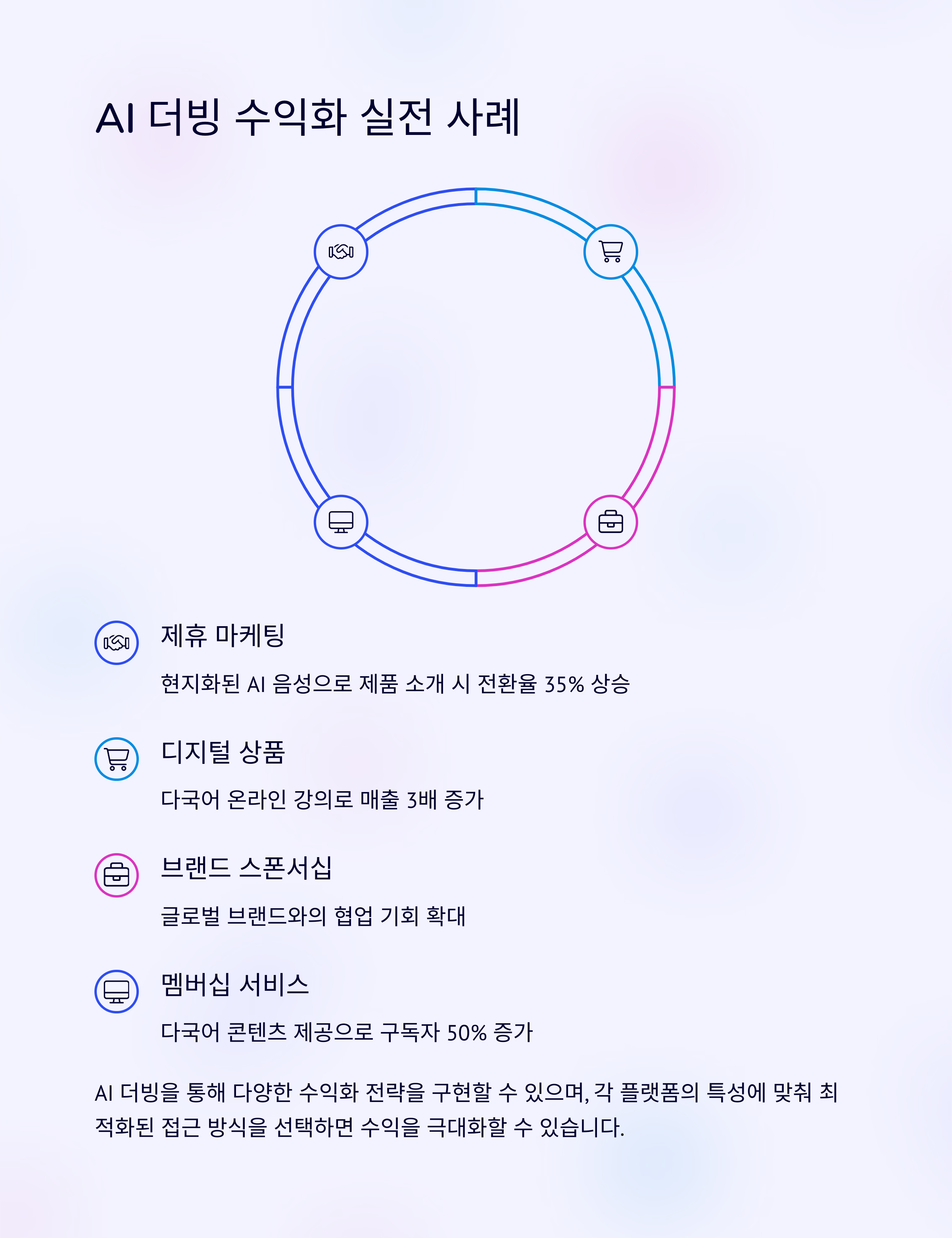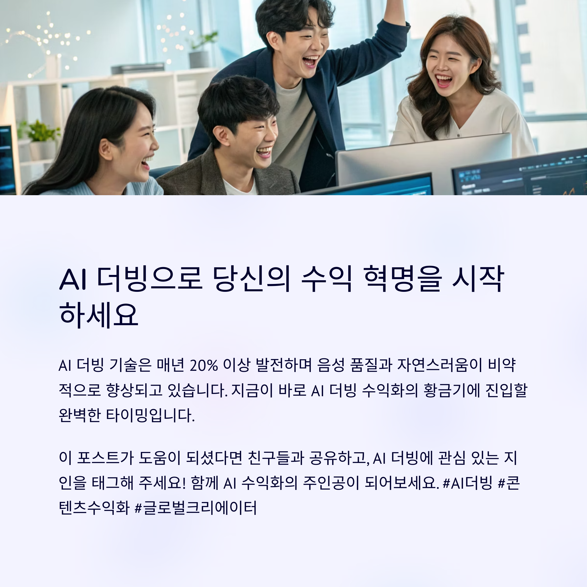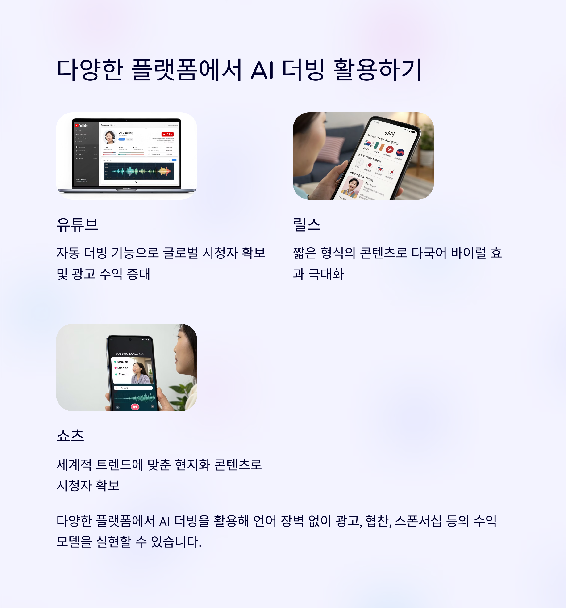 AI 더빙은 자연어 처리 기술과 음성 합성 기술의 발전으로 다양한 언어와 억양을 자연스럽게 재현할 수 있게 되어 글로벌 영상 시장에서 수익화 가능성을 크게 높였습니다. 특히 유튜브, 쇼츠, 릴스 같은 숏폼 플랫폼과의 결합이 빠른 시청자 확보와 수익화로 연결되고 있습니다.