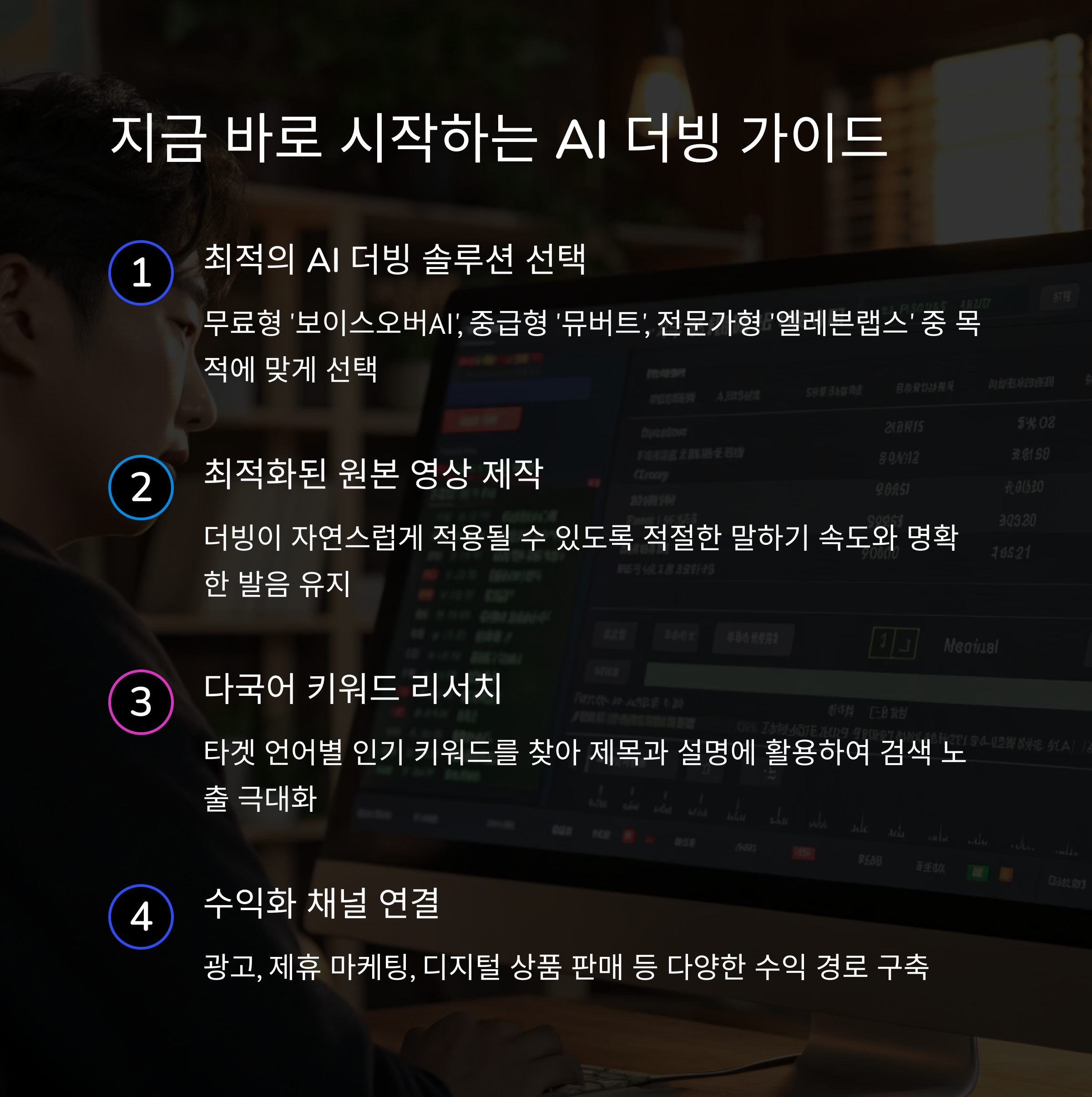 AI 더빙 수익화 전략은 첫째, 유튜브 정책에 맞게 AI 사용 명시, 둘째, SEO 최적화 키워드 삽입, 셋째, 다국어 버전 제작으로 글로벌 타깃 확장, 넷째, 자동화 루틴 구축을 통한 제작 효율 극대화입니다. 콘텐츠를 다양화하여 안정적인 수익을 확보할 수 있습니다.