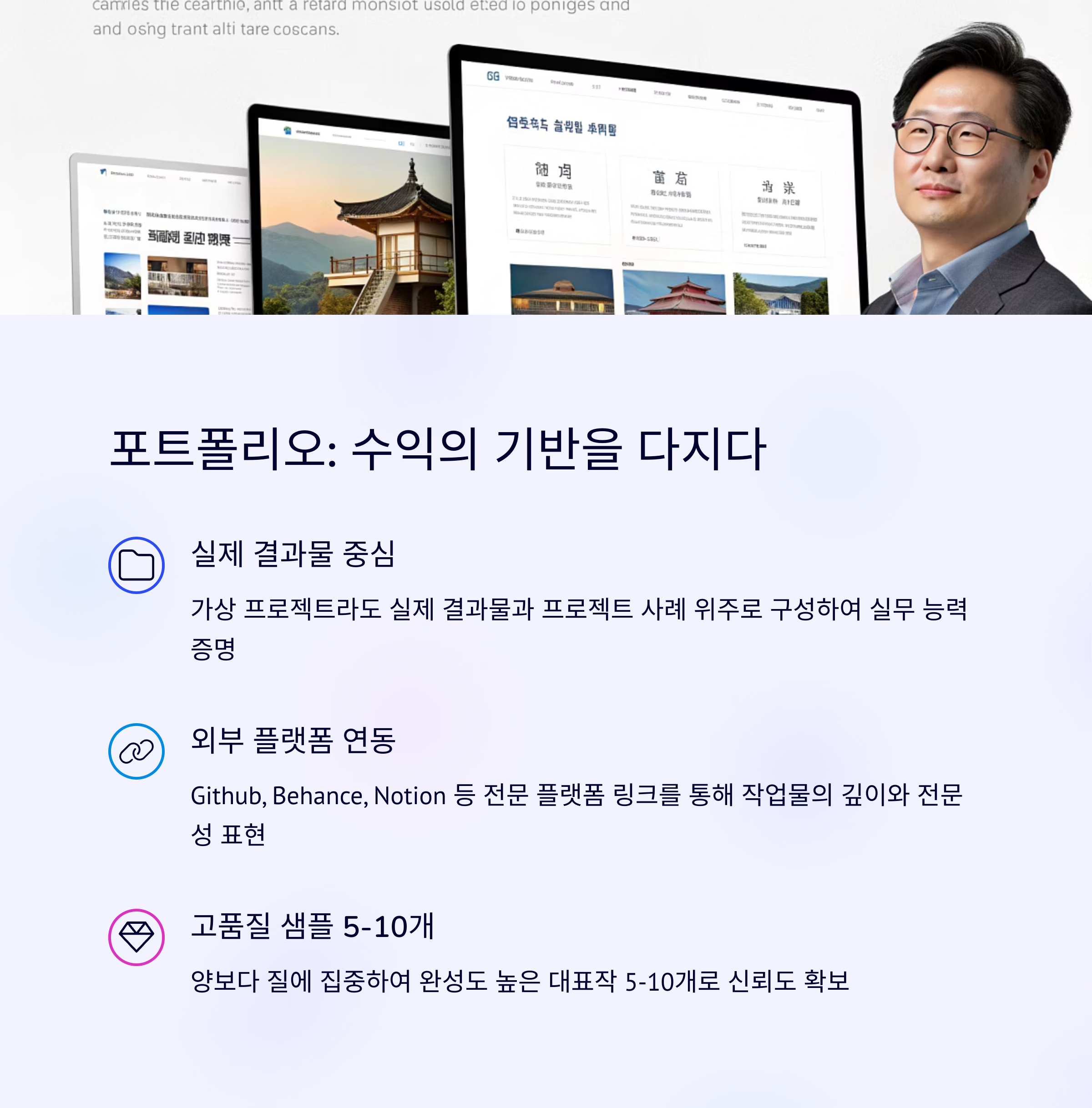 | 프로젝트 수익, 전자책 판매, 강의 연계 | 포트폴리오 구축, 가격 책정, 프로필 최적화 | 틈새시장 공략, 네트워킹, 후기 관리 |