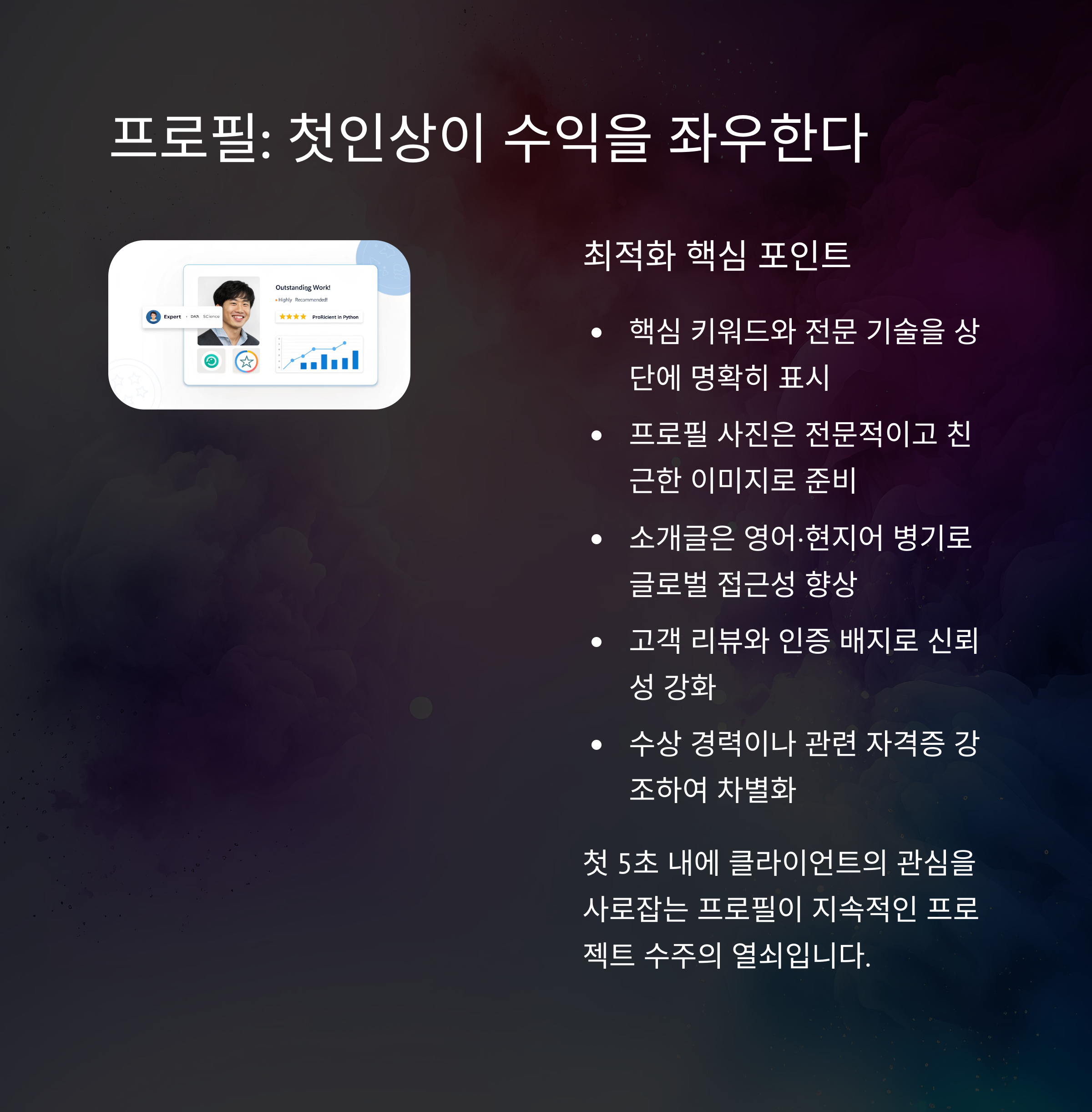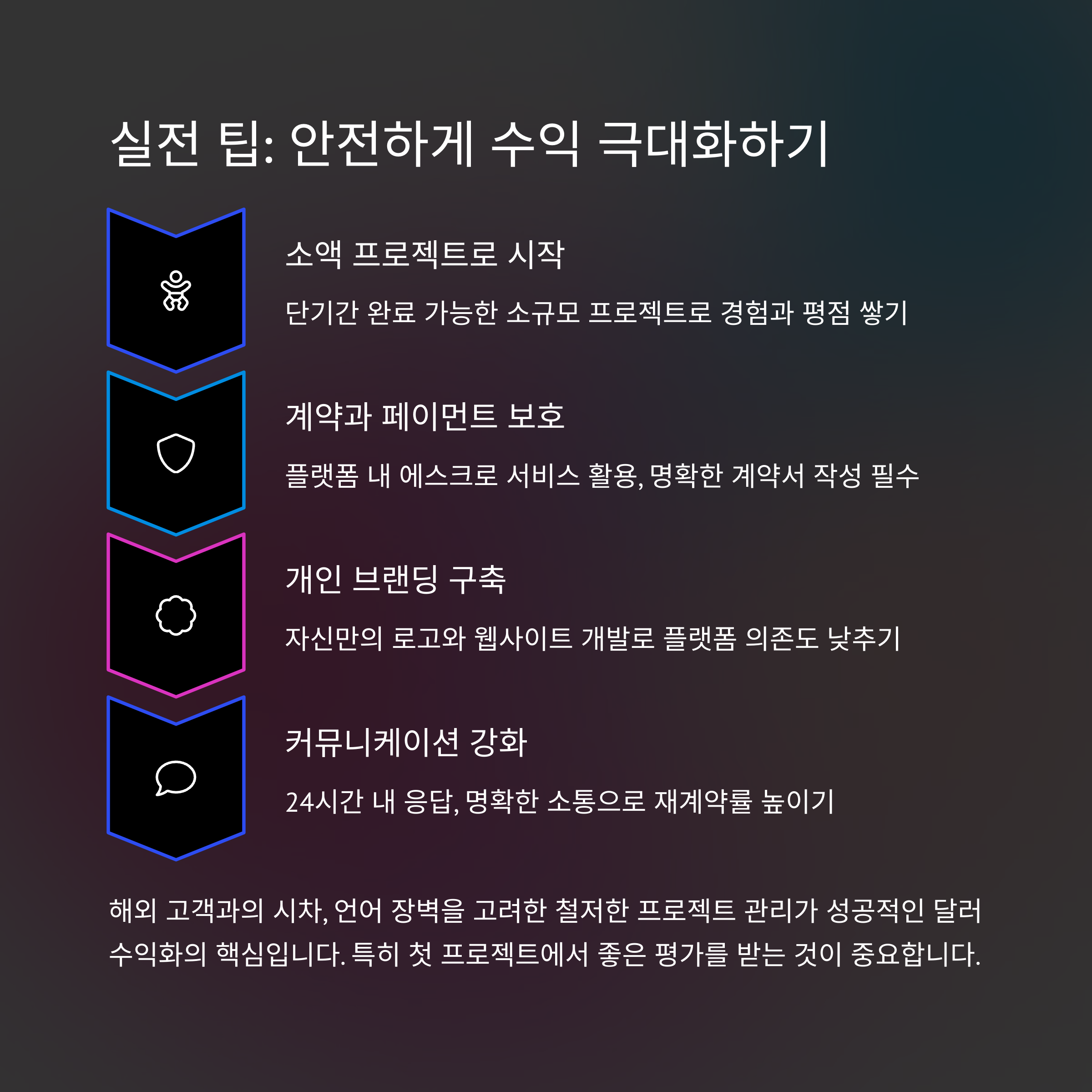 달러 수익을 만들기 위해서는 프로필 최적화, 틈새시장 공략, 맞춤형 제안서 작성이 필수입니다. 초기에는 낮은 단가로 실적을 쌓고 리뷰와 평점을 확보한 후, 점진적으로 단가를 올리는 전략이 효과적입니다.