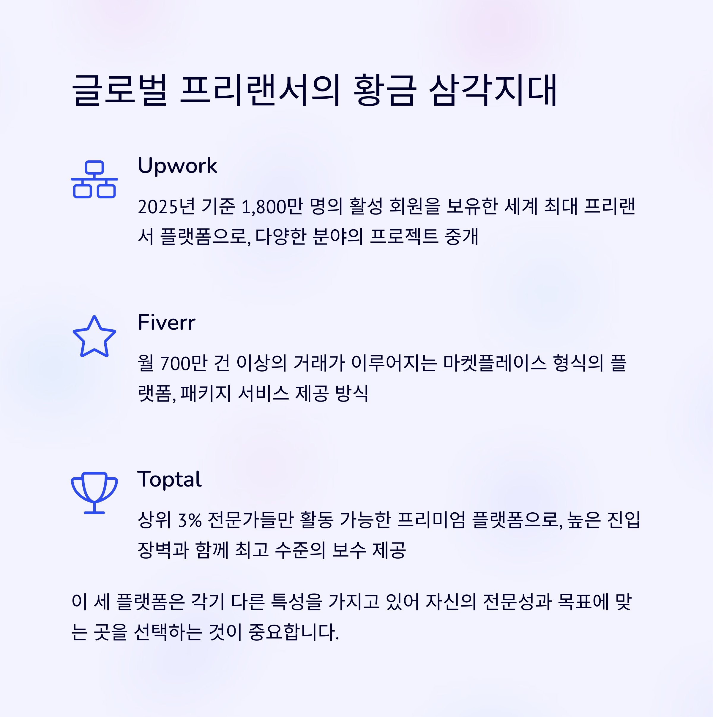 | 주요 플랫폼 | Upwork, Fiverr, Freelancer, Toptal, Guru |