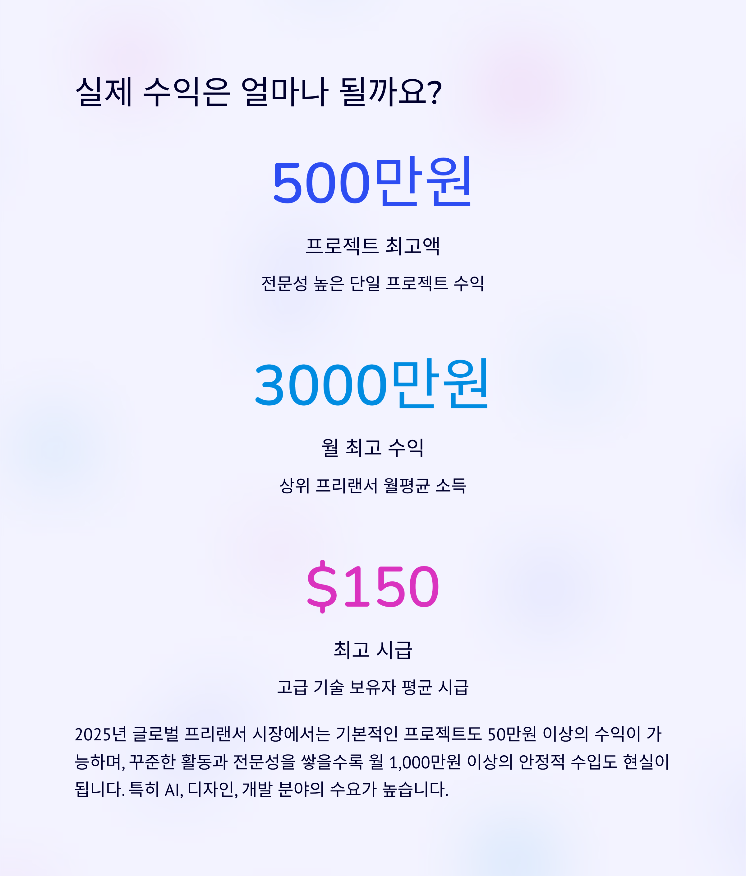 2025년, 글로벌 프리랜서 플랫폼은 달러 수익화의 최적 기회입니다. 초기 준비와 전략적 접근만 갖춘다면 누구나 월 1,000만 원 이상의 글로벌 수익을 현실적으로 달성할 수 있습니다. 지금 바로 도전해보세요.