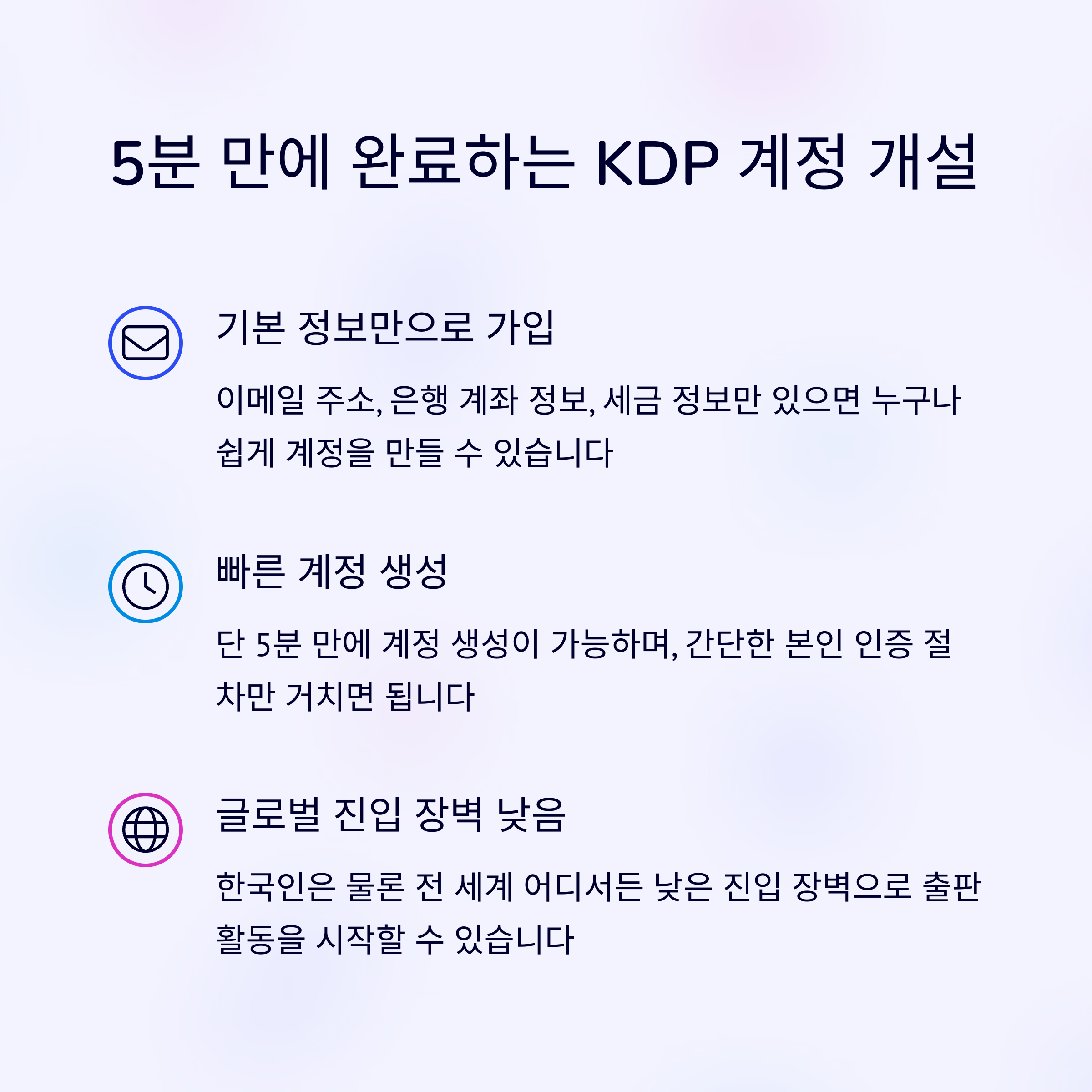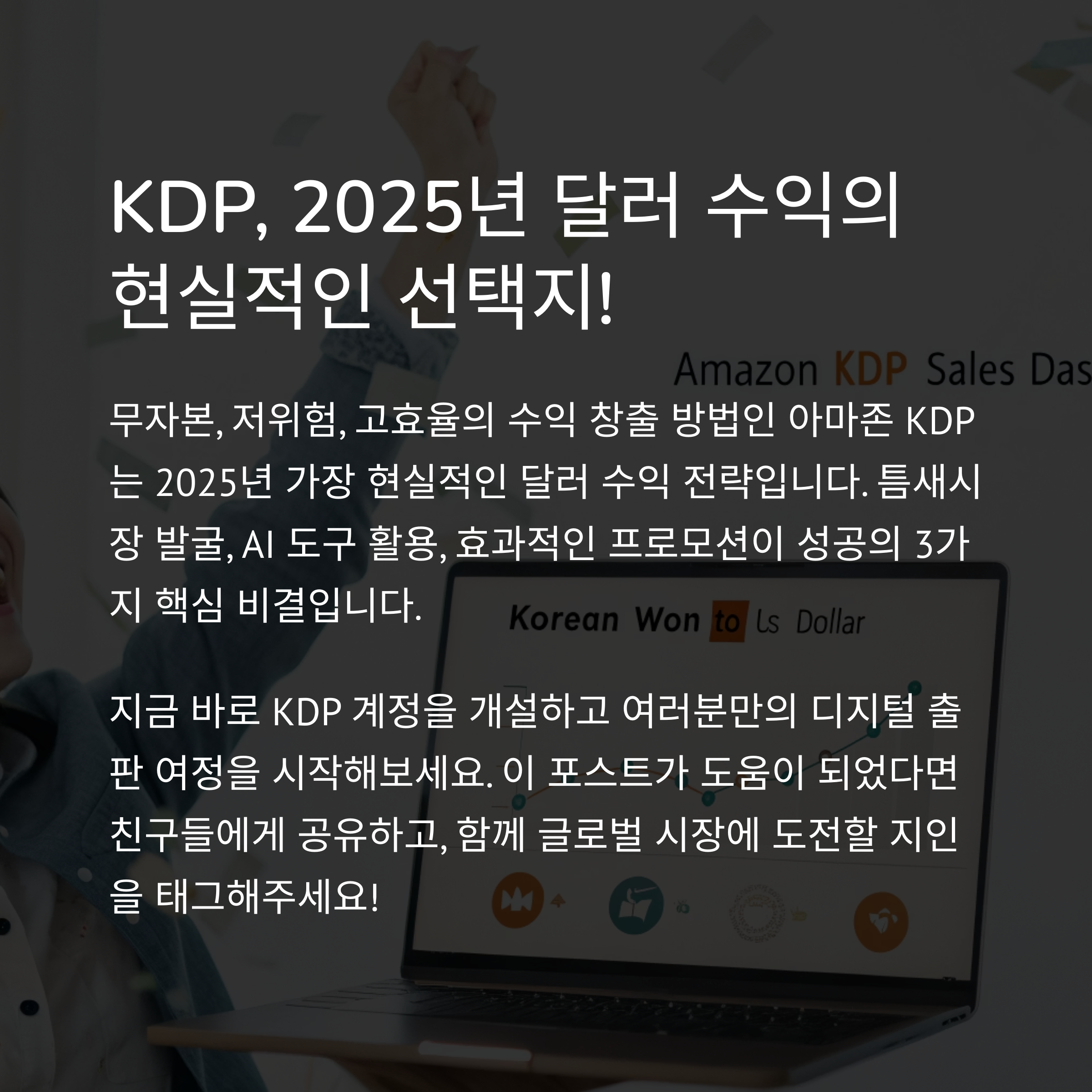 아마존 KDP를 활용하면 72시간 이내 미국 시장에 전자책을 출시하고, 무자본으로 달러 수익을 만들 수 있습니다. 니치 시장 공략과 키워드 최적화를 통해 글로벌 독자와 연결되는 기회를 놓치지 마세요.