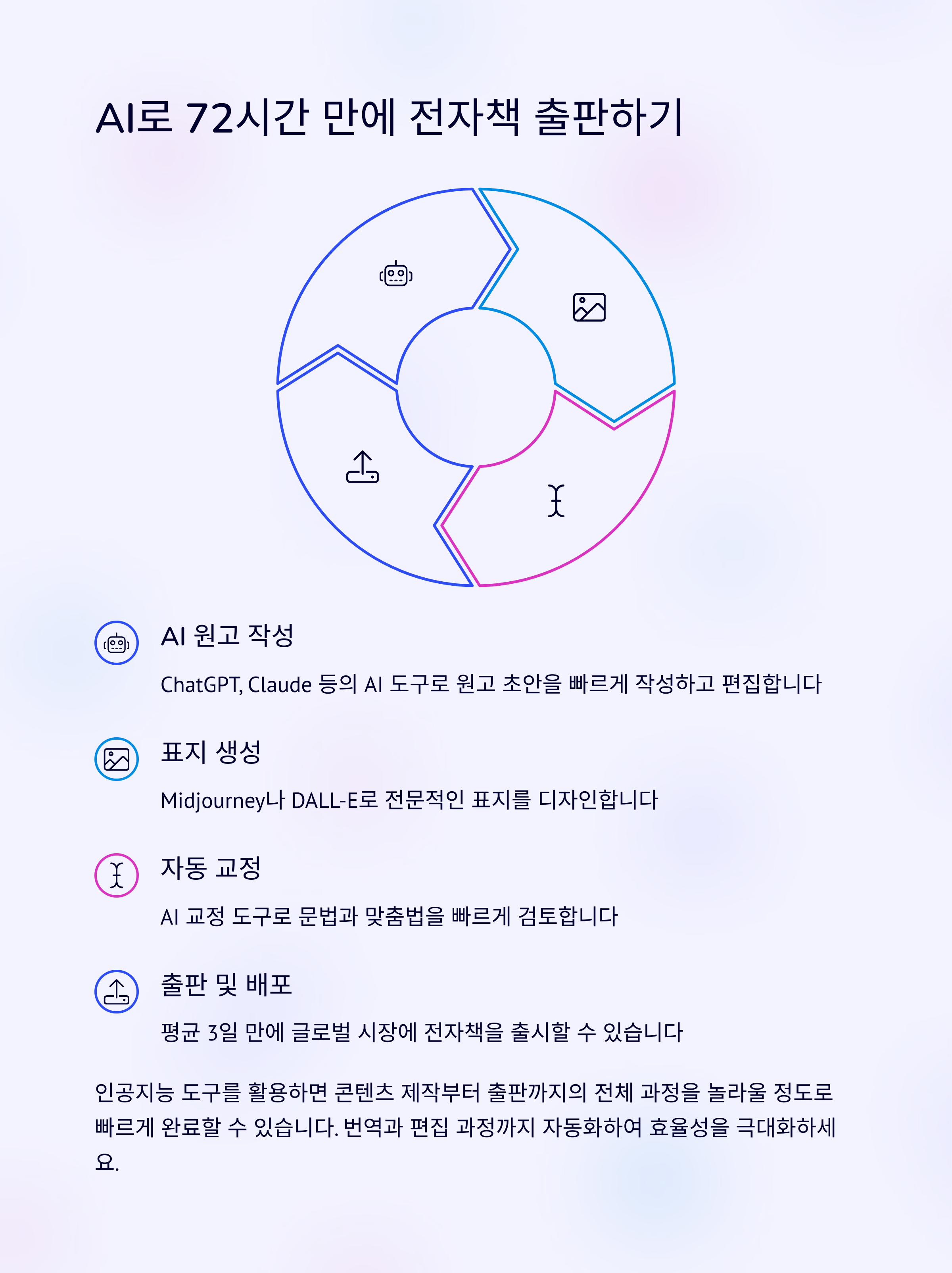 아마존 KDP를 활용하면 무자본, 무재고, 무배송으로 미국을 포함한 글로벌 시장에 전자책을 출판하고 수익을 창출할 수 있습니다. 특히 니치 시장 공략과 키워드 최적화 전략을 통해 반복적인 패시브 인컴을 만들 수 있으며, AI 도구를 활용하면 72시간 이내 출판도 가능합니다.