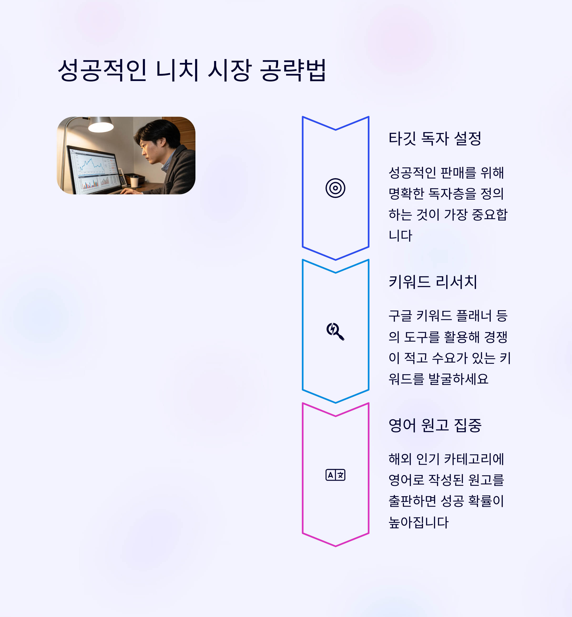 성공적인 진출을 위해서는 대중적인 분야 대신 니치 주제를 공략하고, 키워드 최적화와 SEO를 철저히 준비하는 것이 필수입니다. 표지 디자인과 내지 편집 품질도 미국 소비자 기준에 맞춰야 구매 전환율을 높일 수 있습니다.