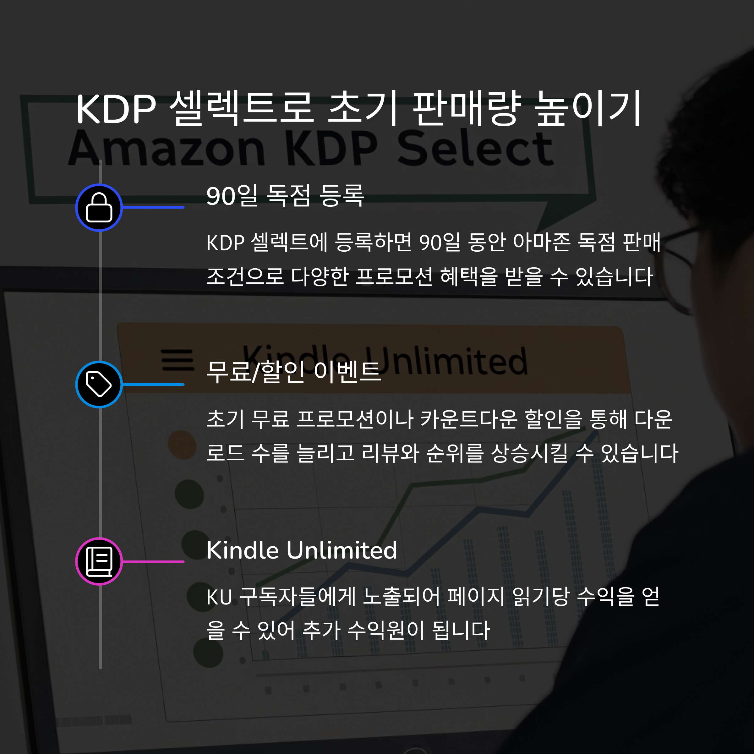 | 계정 개설, 세금 등록, 표지·내지 제작 | 니치 키워드 공략, KDP 셀렉트 활용 | Kindle Unlimited, 페이지당 로열티 추가 수익 |