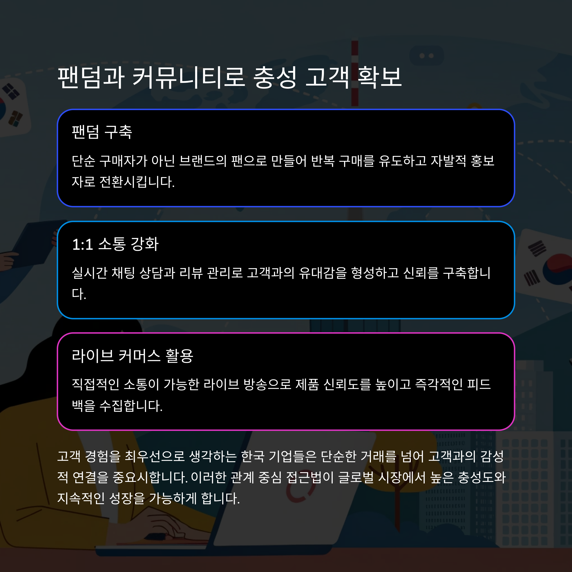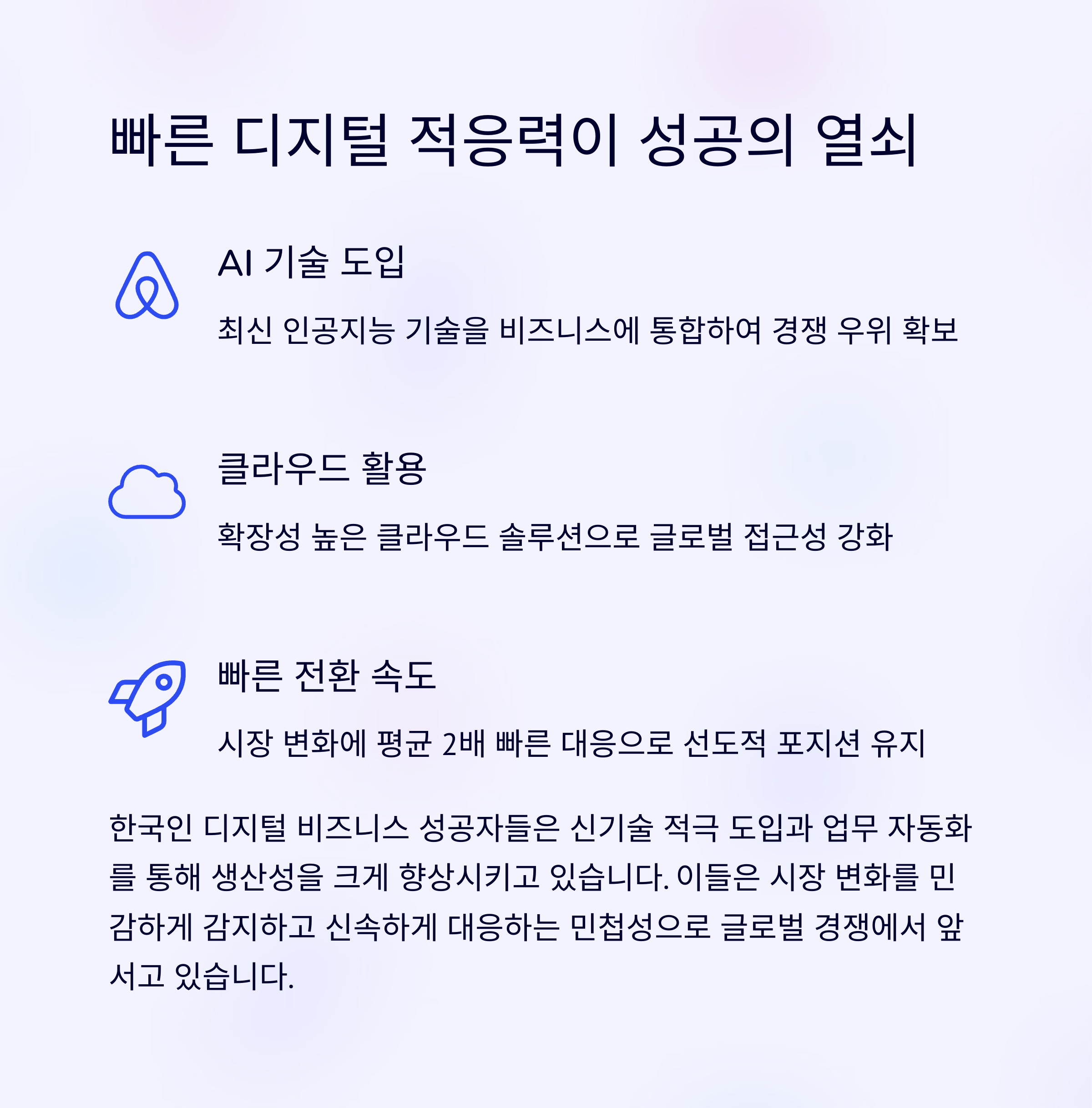 데이터 기반 시장 조사, 디지털 도구 활용, 고객 경험 중심 운영, 카테고리 다각화가 글로벌 마켓에서 성공하는 한국인들의 주요 전략입니다. 특히 데이터 분석을 통한 니즈 파악과 빠른 피드백 반영이 인상적입니다.
