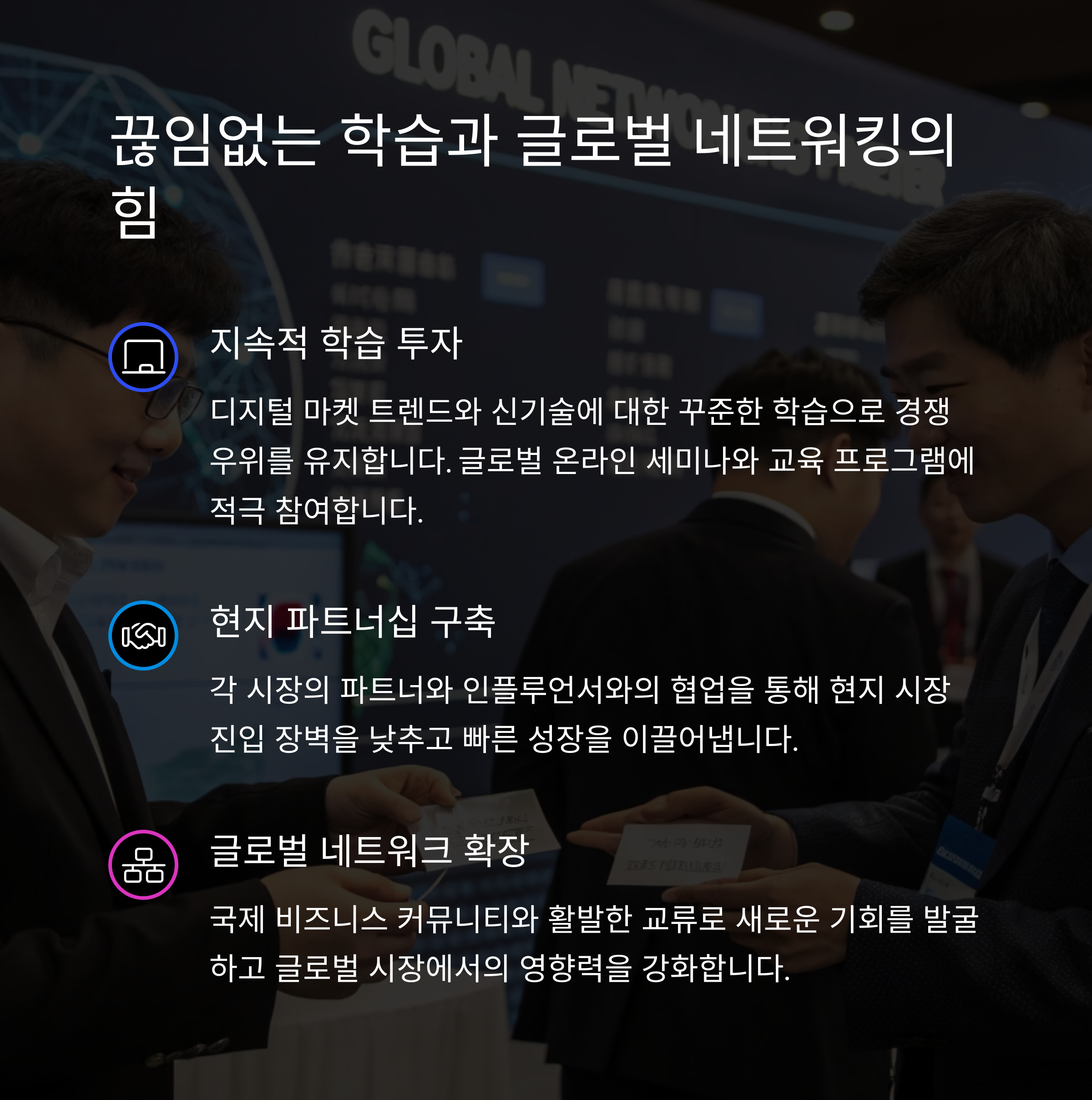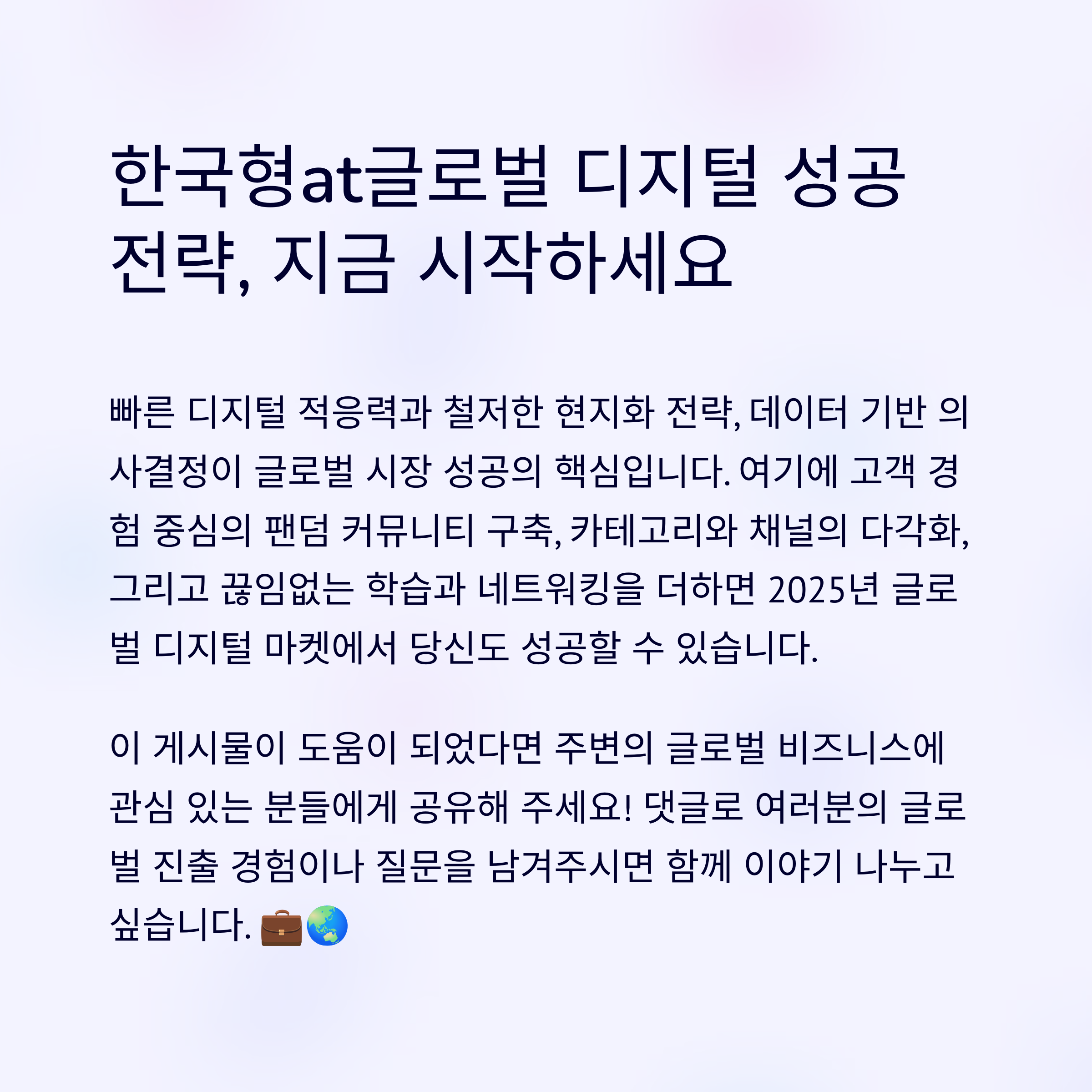 글로벌 디지털 마켓에서 성공하기 위해서는 단순히 제품만 좋은 것이 아니라, 다양한 전략적 접근이 필요합니다. 빠른 디지털 적응력, 현지화된 멀티채널 마케팅, 데이터 기반 시장 조사, 고객 경험 강화, 그리고 꾸준한 학습과 네트워킹이 핵심 요소입니다. 글로벌 시장은 빠르게 변화하지만, 준비된 이들에게는 무한한 기회가 열려 있습니다. 오늘 바로 디지털 글로벌 진출을 위한 첫걸음을 내딛어 보세요.