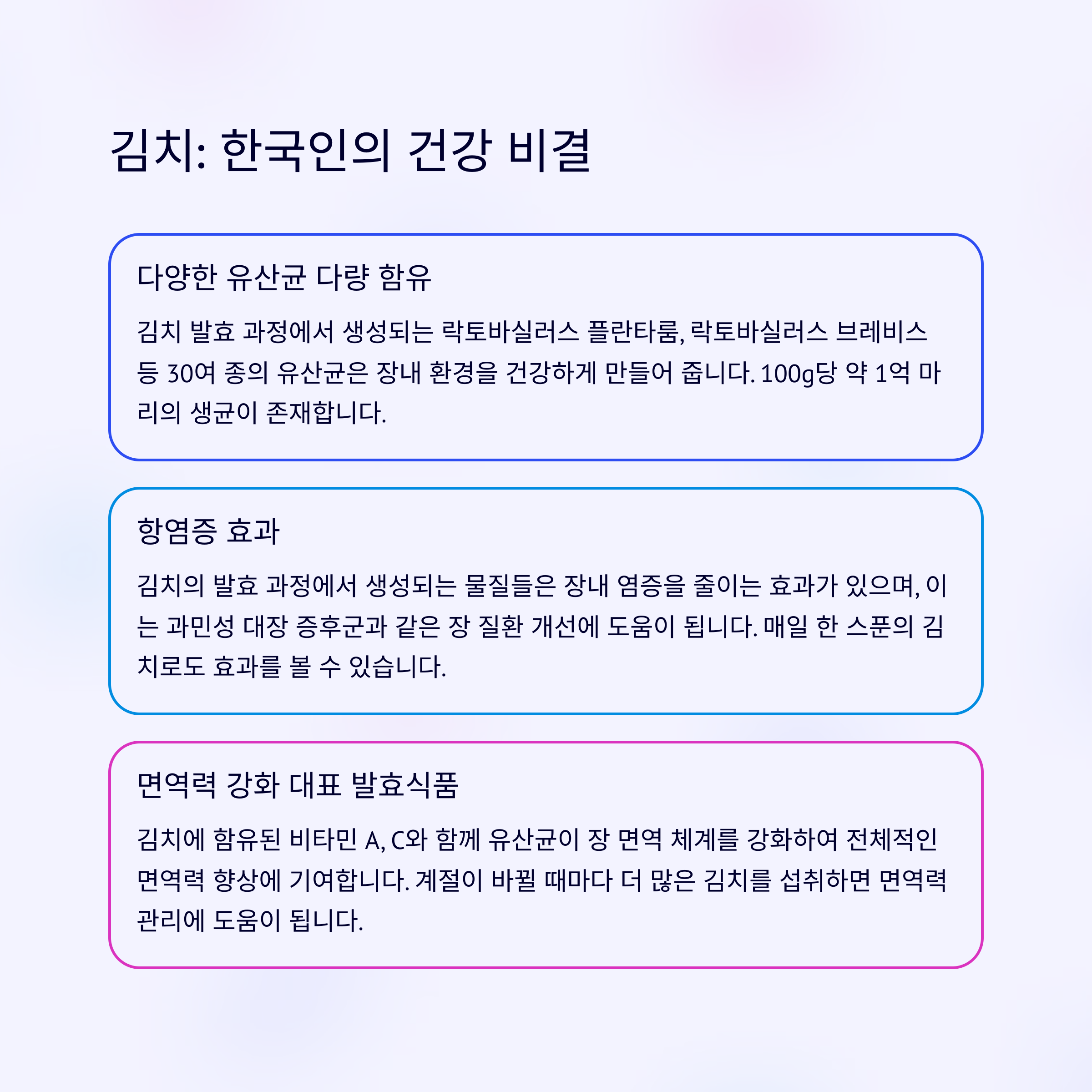 | 식이섬유와 효소 액티니딘으로 변비 완화 | 유산균을 직접 공급해 장내 유익균 증식 | 발효 과정의 유산균이 장 운동을 도와줌 |