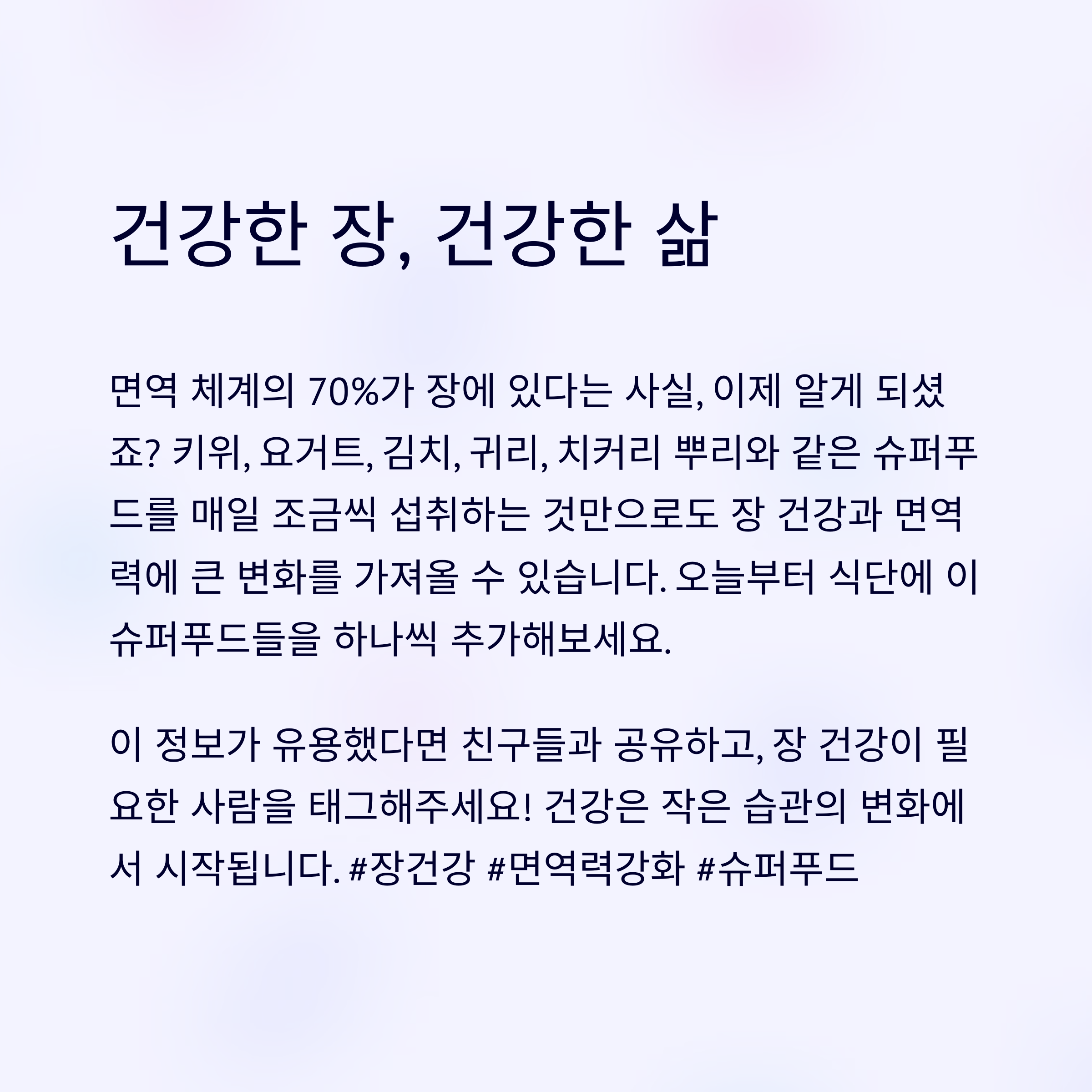 여러분은 장 건강을 위해 어떤 음식을 드시고 계신가요? 또는 소개된 음식 중에서 실제로 효과를 느껴본 경험이 있다면 댓글로 자유롭게 공유해주세요. 여러분의 경험이 다른 분들께 큰 도움이 됩니다!