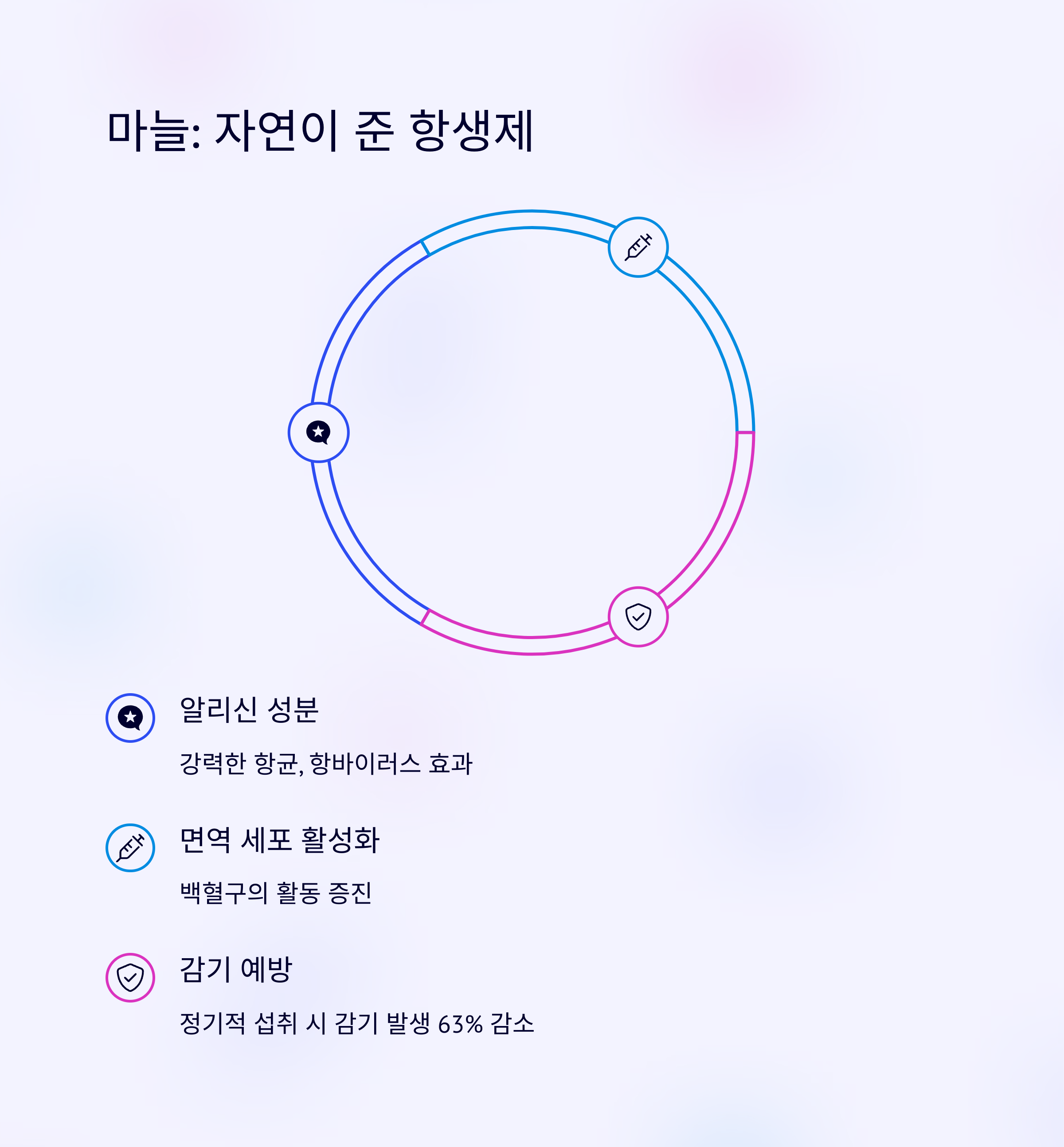 마늘은 알리신이라는 항균 성분 덕분에 바이러스 감염 예방에 탁월하며, 아스파라거스는 프리바이오틱스가 풍부해 장 건강을 돕습니다. 잎채소는 엽산과 항산화 성분으로 염증을 완화시키고 전반적인 면역 체계를 강화하는 데 중요한 역할을 합니다. 이러한 음식들을 꾸준히 식단에 포함시키면 봄철 면역 관리에 큰 도움이 될 수 있습니다.