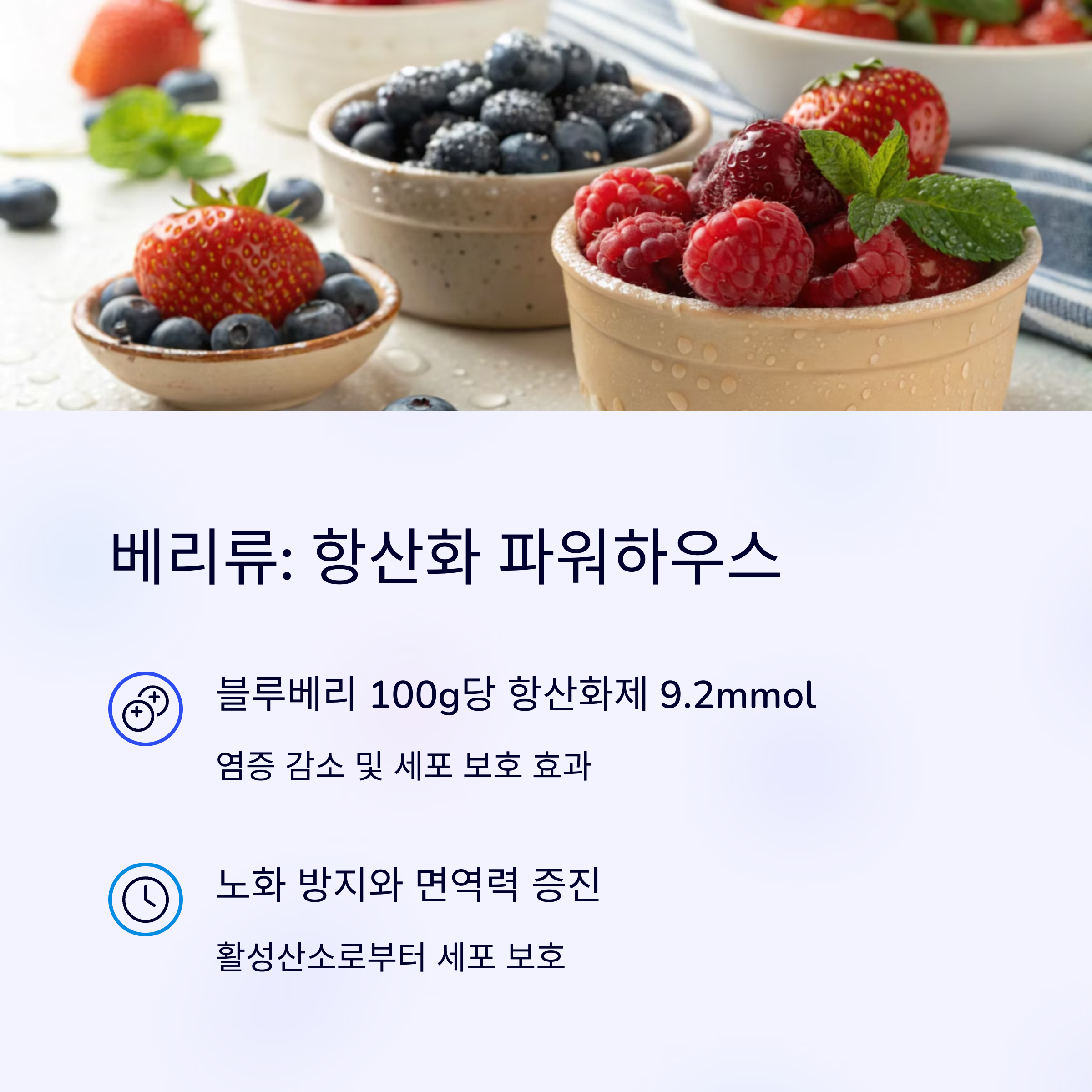 | 비타민 C가 풍부해 감기 예방에 효과적입니다. | 염증 완화, 장 건강 개선 효과가 있습니다. | 항산화제 풍부, 산화 스트레스 완화에 기여합니다. |