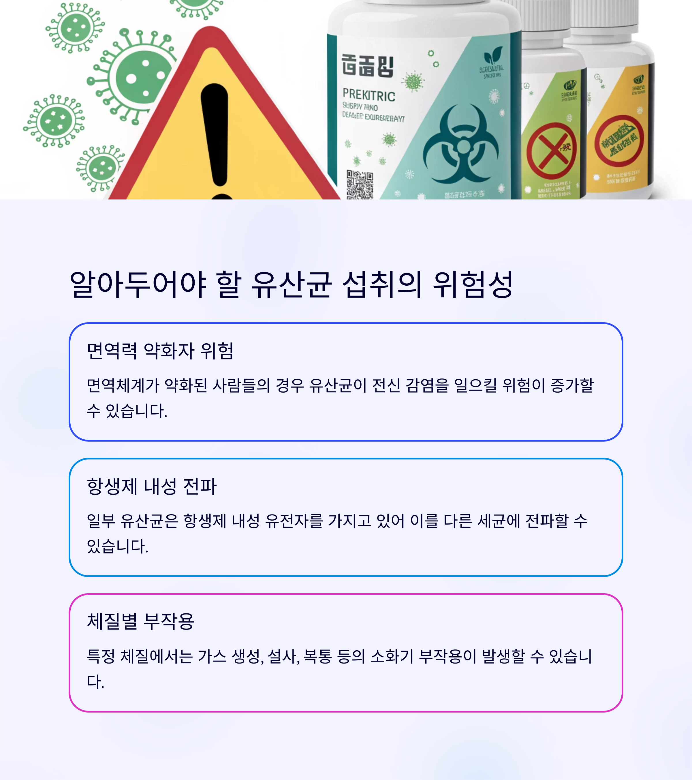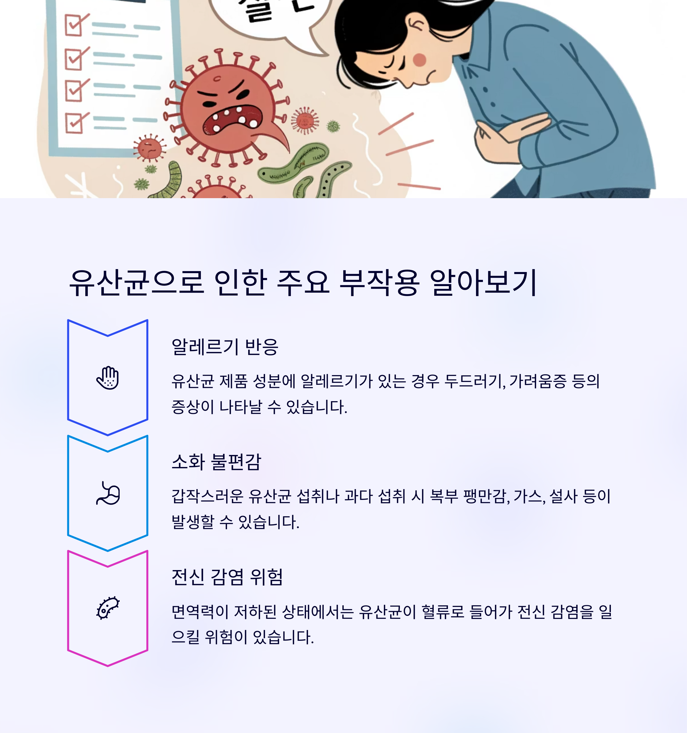 | 유산균 부작용 | 과다 섭취 시 소화 장애나 감염 가능성이 있음 |