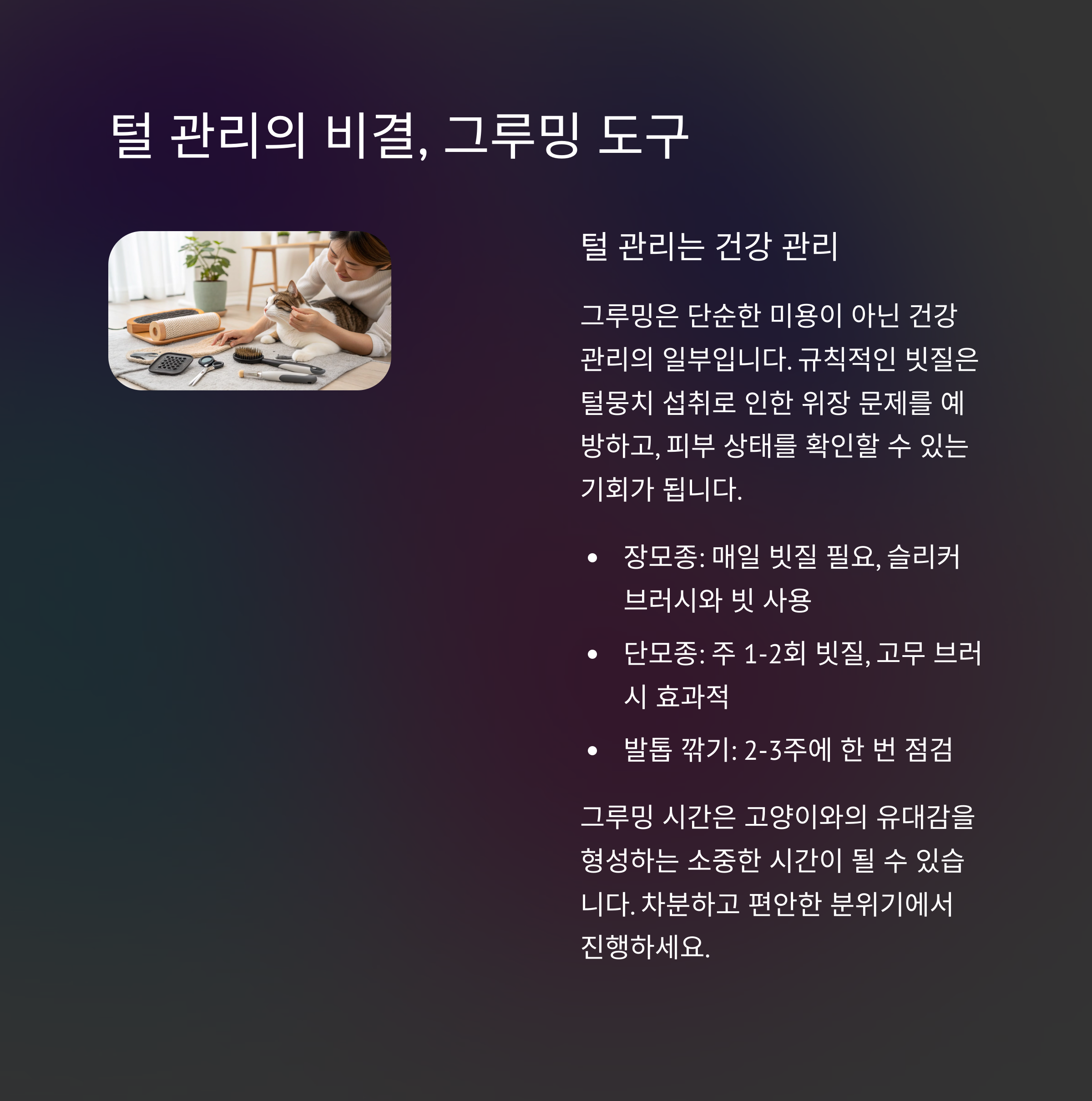 그루밍 도구도 꼭 챙기세요! 손톱깎이, 브러시, 고양이용 치약은 기본이고, 하루 한 번 빗질과 주 2회 양치질은 건강 관리의 시작이에요. 여기에 숨숨집이나 모니터링 카메라, 공기청정기 같은 추가 용품이 있으면, 더 쾌적하고 편안한 환경을 만들어줄 수 있어요.