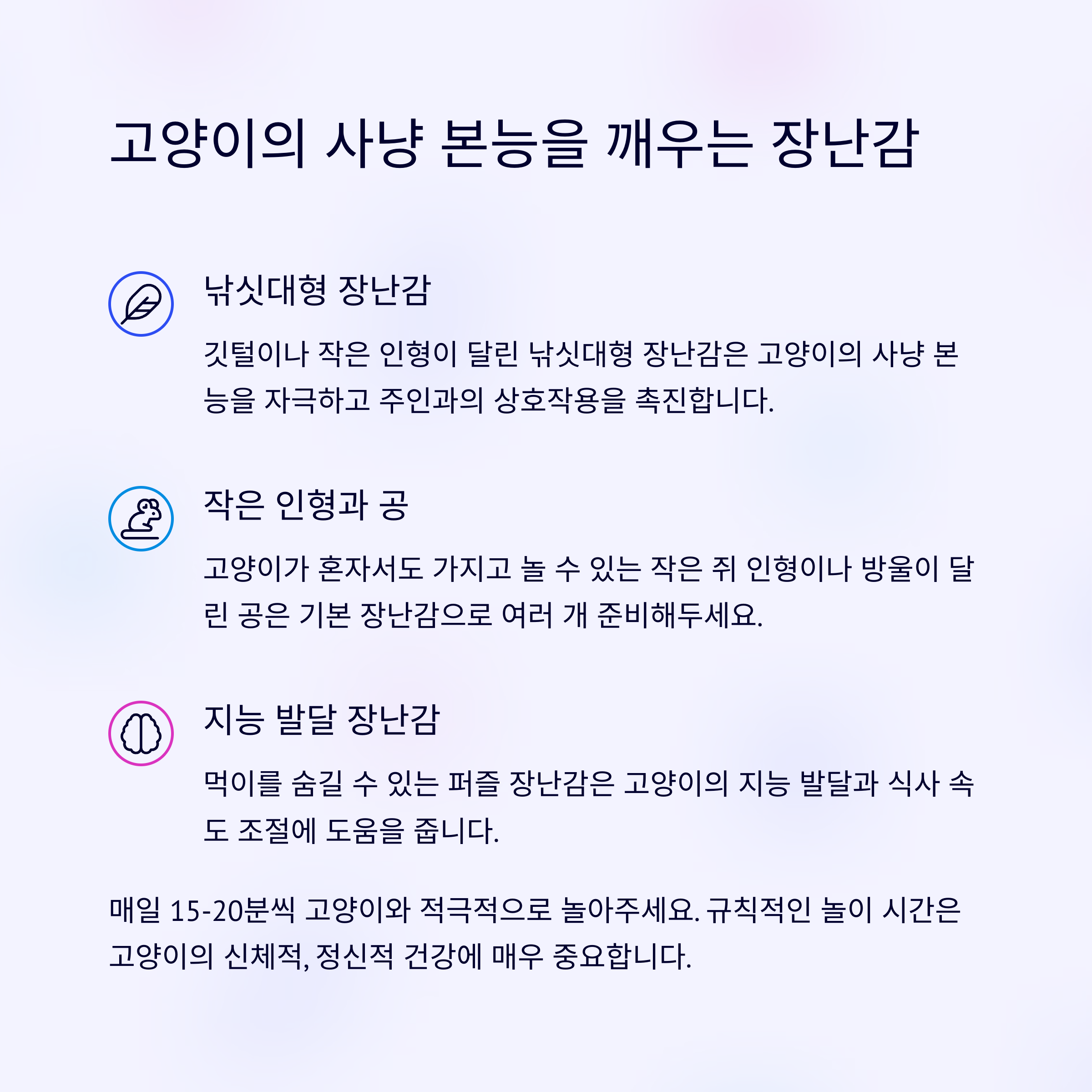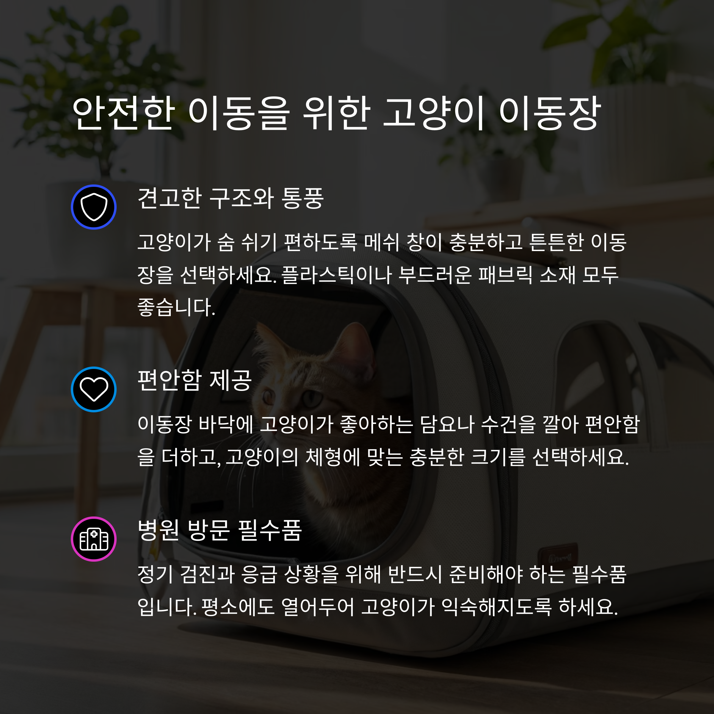 | 필수 용품 | 이동장, 사료, 화장실, 스크래쳐, 장난감 등 기본 구성 |