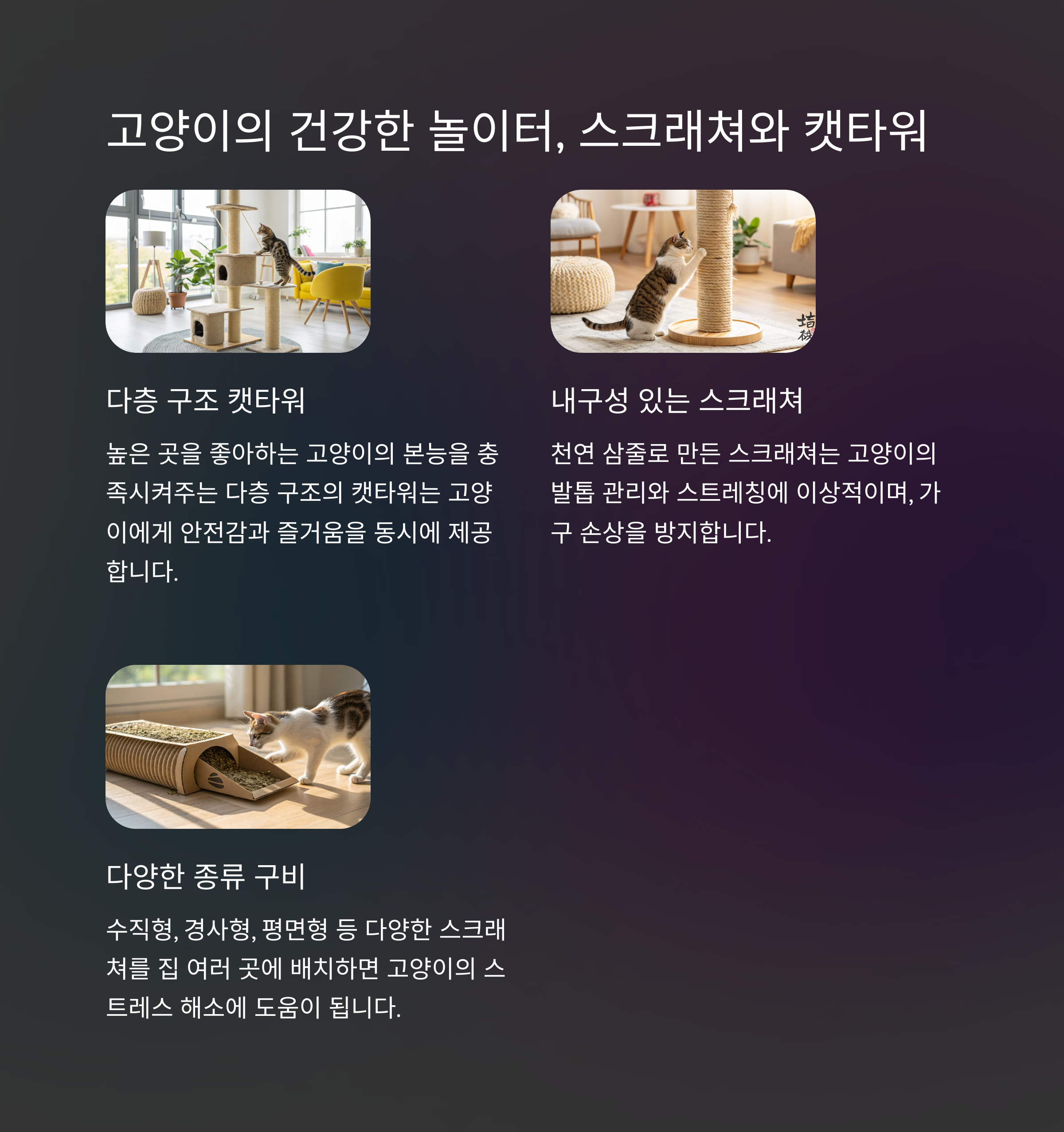 화장실은 고양이 수보다 하나 더 많은 수를 준비하고, 두부모래나 벤토나이트 같은 친숙한 모래로 시작해보세요. 여기에 스크래쳐와 캣타워는 스트레스 해소에 필수인데요, 특히 수직 공간을 좋아하는 고양이 특성상 캣타워는 정말 좋은 놀이 겸 쉼터가 되어준답니다.