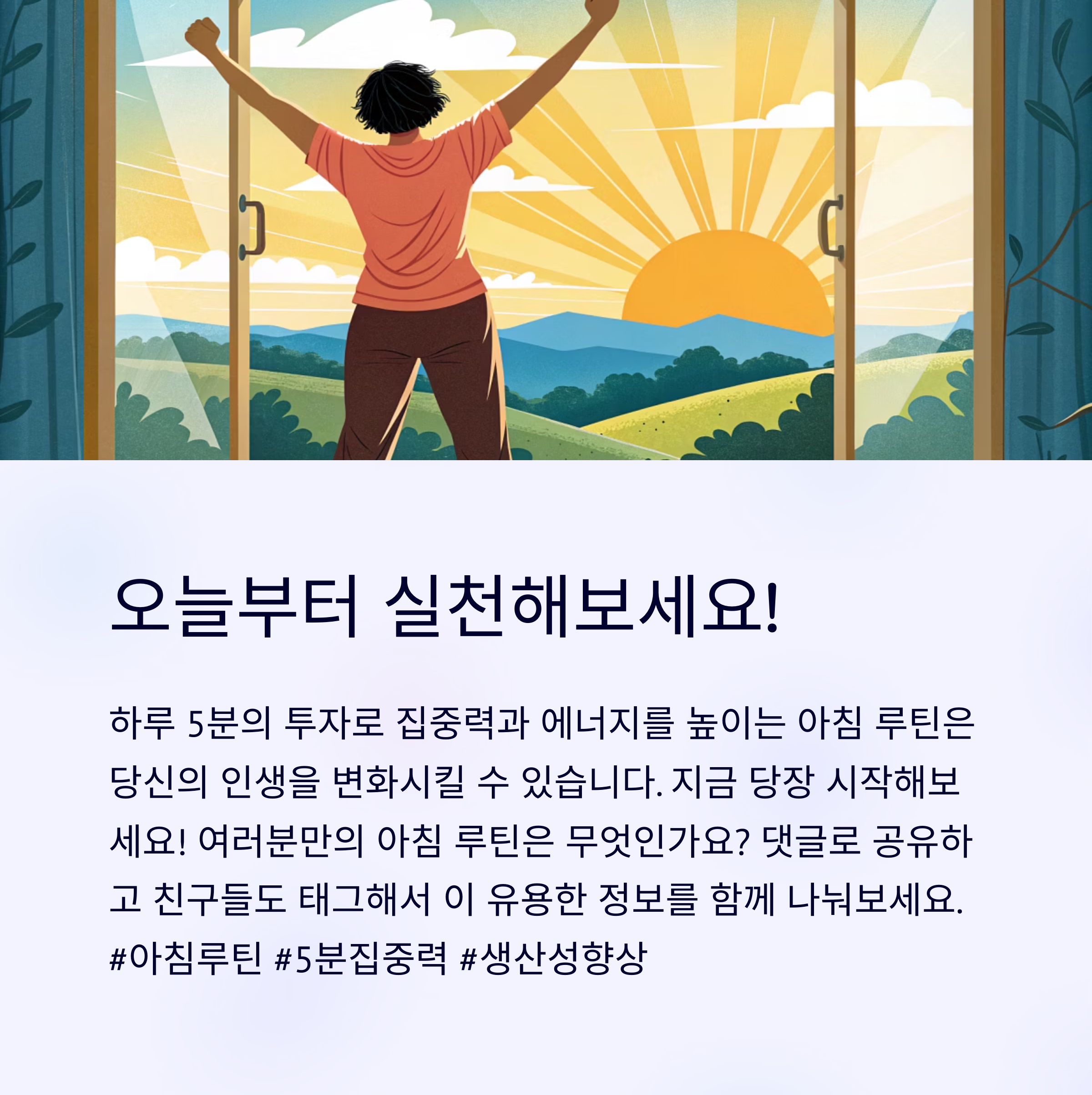 현대인에게 아침은 늘 정신없고 빠르게 흘러가죠. 하지만 단 5분만 투자하면 뇌가 깨어나고, 하루의 집중력이 눈에 띄게 달라질 수 있어요. 이 루틴은 과학적 데이터에 기반해 구성됐으며, 명상, 스트레칭, 물 마시기, 목표 설정, 감사 일기까지 누구나 실천 가능한 짧고 강력한 습관입니다. 하루의 시작을 정돈된 마음과 활력으로 바꾸고 싶다면, 오늘부터 따라 해보는 건 어떨까요? 😊