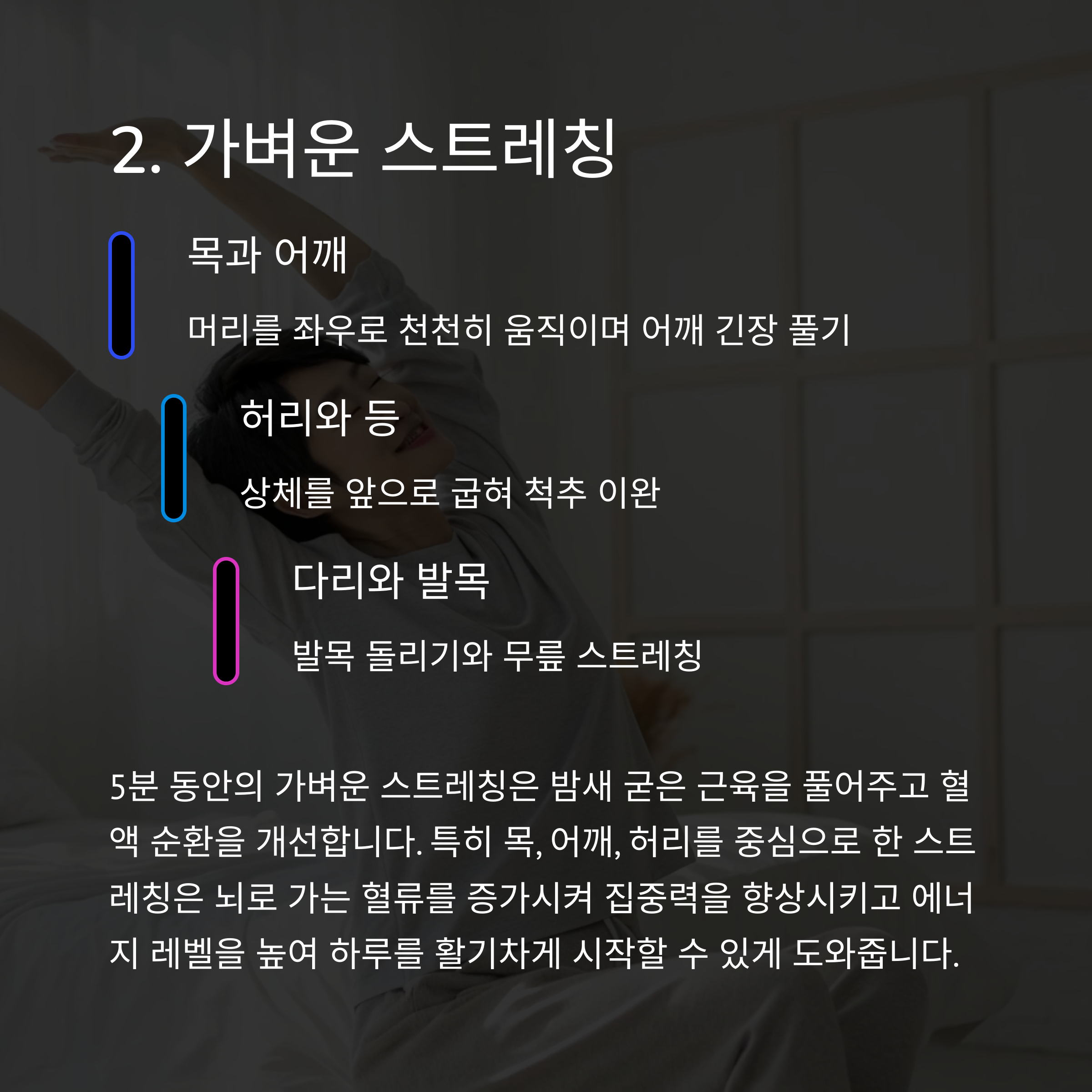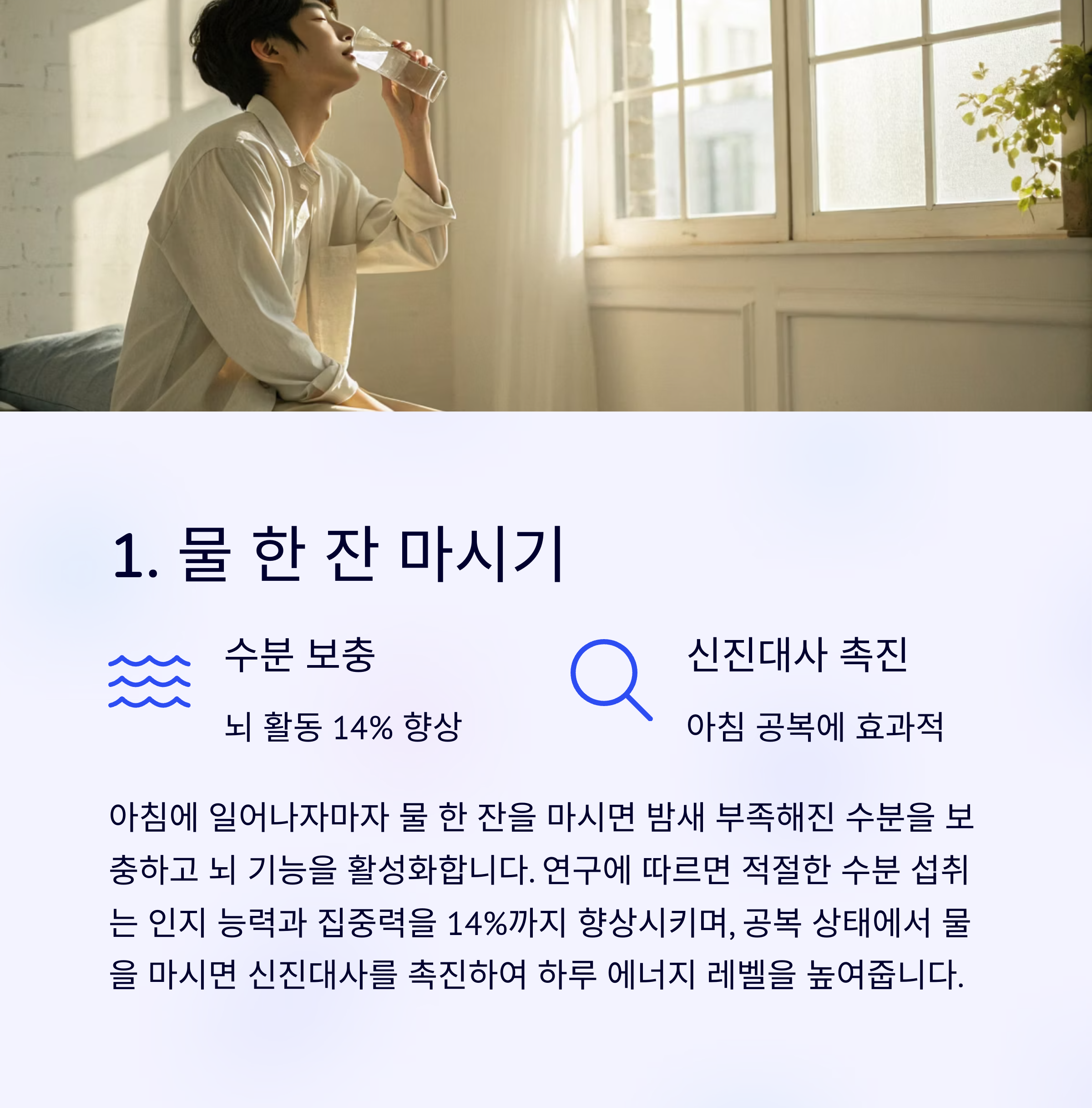 아침에 일어나자마자 물 한 잔을 마시는 것으로 하루를 시작해보세요. 수면 중 손실된 수분을 보충하면서 뇌와 신진대사를 깨우는 효과적인 첫 걸음이에요. 이어서 가벼운 스트레칭이나 점핑잭처럼 몸을 움직이면 혈액순환이 활발해지고, 엔도르핀 분비로 기분도 좋아집니다.
