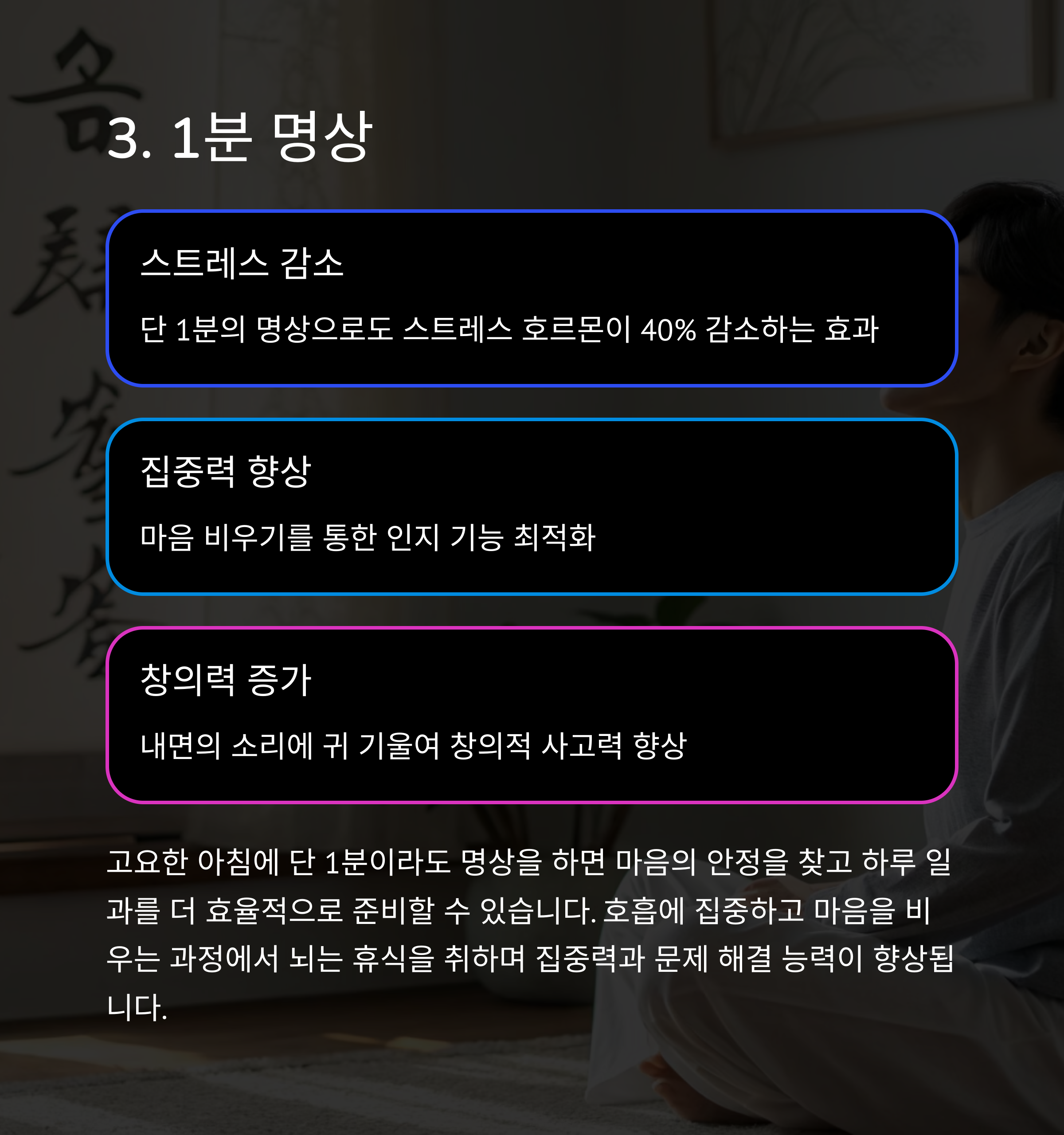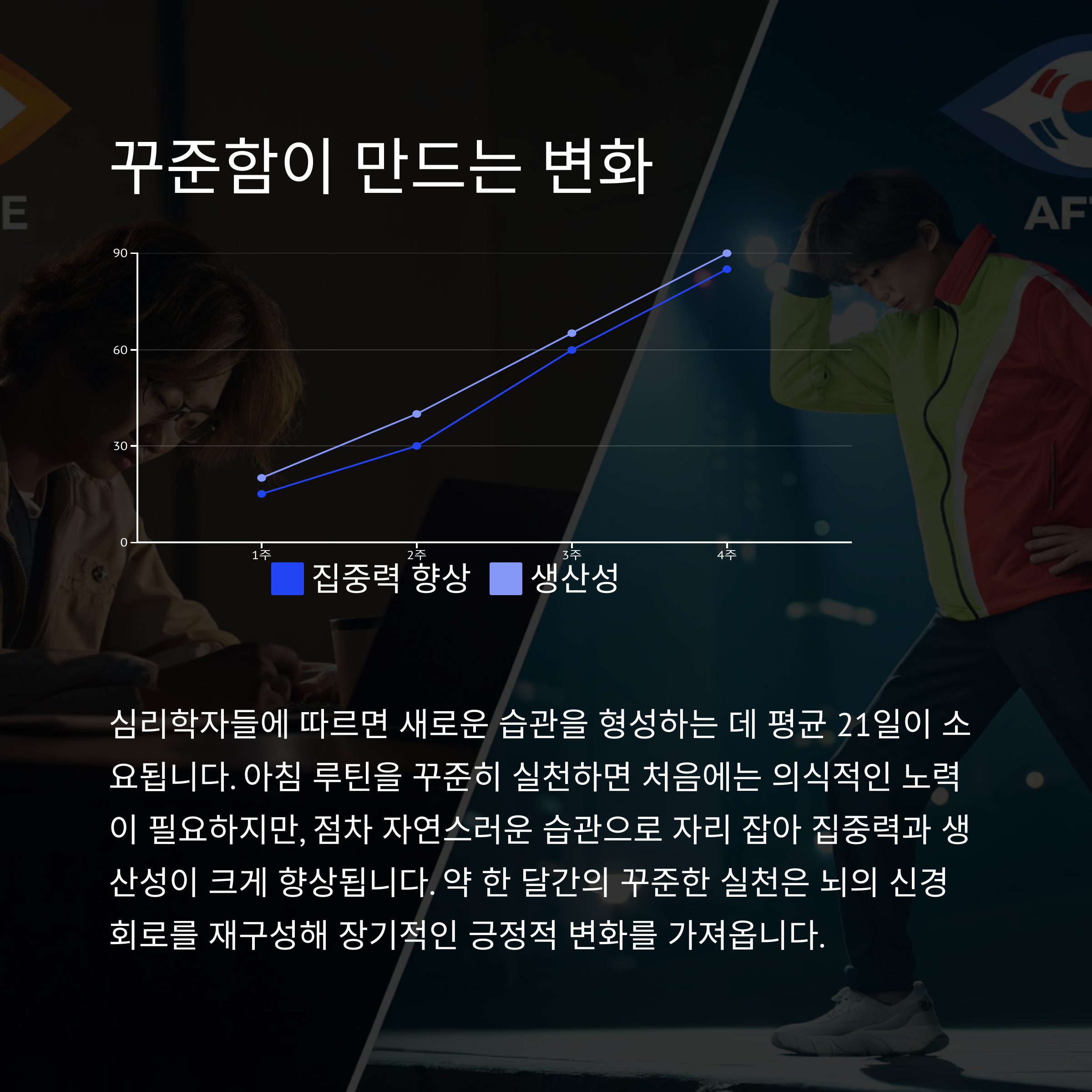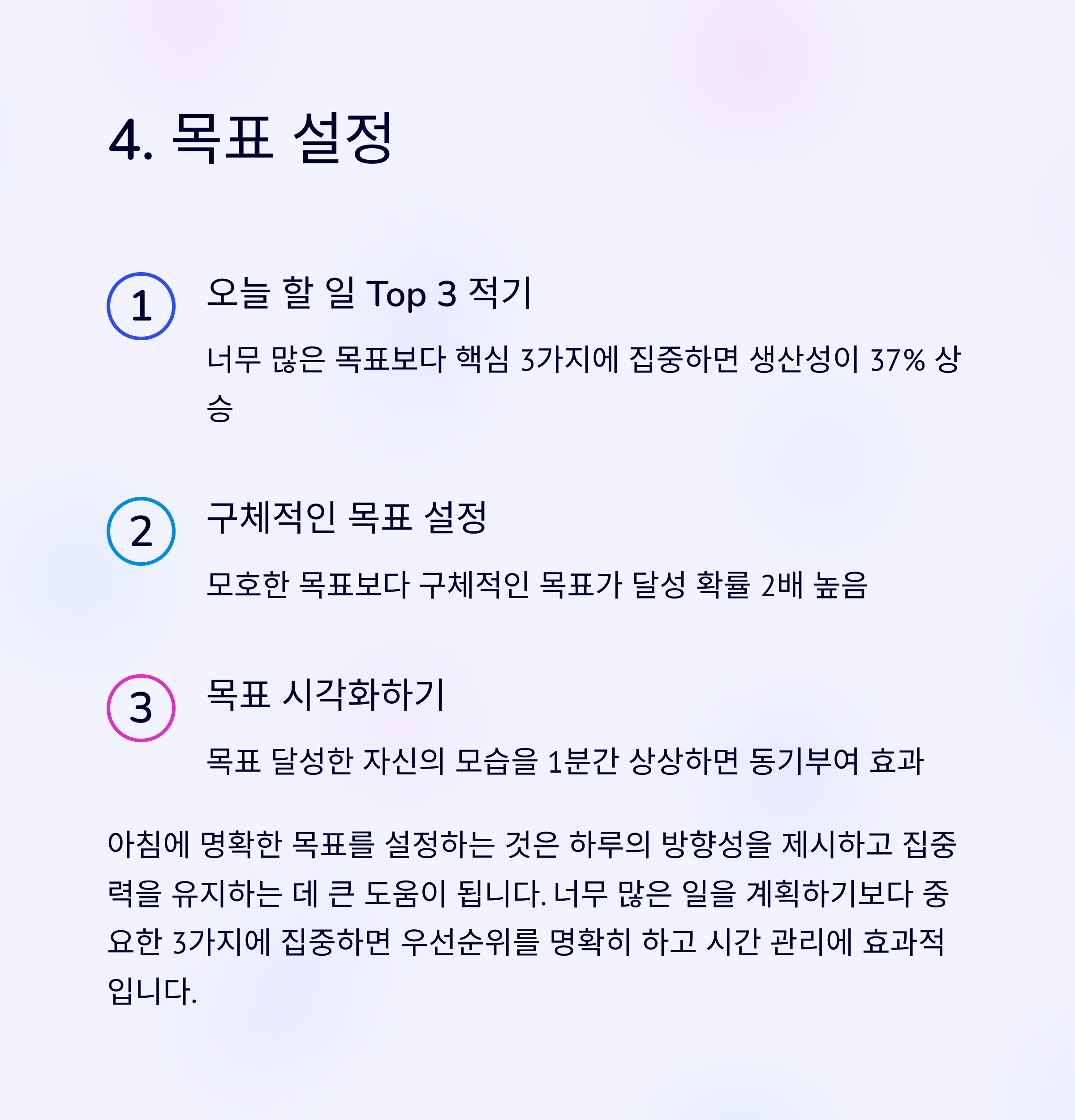 | 스트레칭, 명상, 물 마시기 포함 | 하루 집중력 + 생산성 증가 | 정신 건강과 긍정 마인드 형성 |